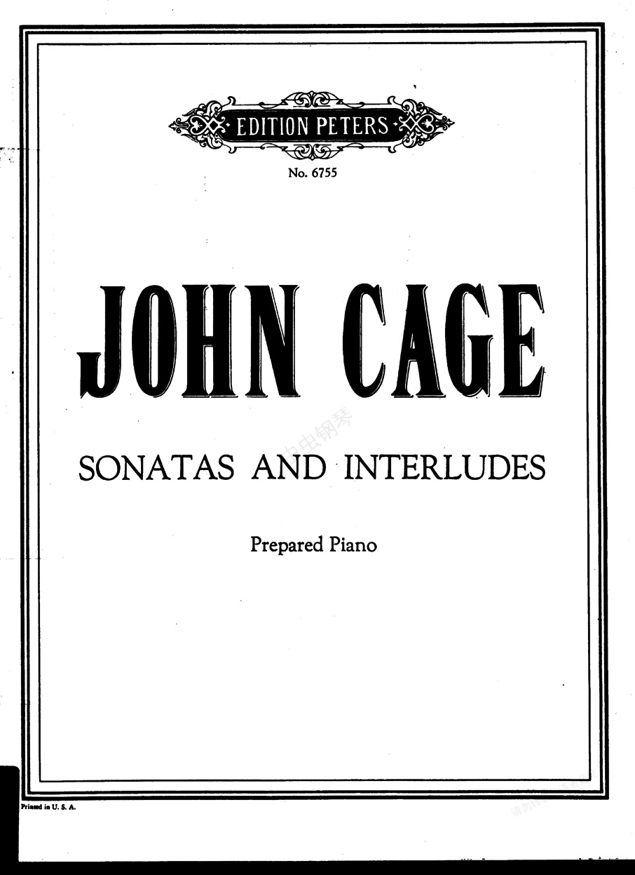 为加料钢琴而作的奏鸣曲与间奏曲 and for Piano《为加料钢琴而作的奏鸣曲与间奏曲》 and for Piano ,作于1946~1948年,1949年由阿加米亚首演,曾成为当年的重要事件,被赞为“拓展了音乐艺术领域”,获得了古根海姆基金、美国国家与文学学院奖金。凯奇在1945~1946年间,随沙拉布海学东方哲学,随铃木大拙学禅,开始把东方哲学思想渗透进其创作。凯奇自己说,此曲“尝试表现印度传统上的永恒感情、英雄主义、色情主义、惊叹、愉悦、悲哀、恐怖、愤怒、厌恶以及那种追求平静的倾向。”此曲呈献给钢琴家阿杰米安,全曲结构由题名为奏鸣曲的十六首小曲(每四首为一组)及题名为间奏曲的四首小曲构成。使用的钢琴88键中有一半变了音,塞入螺钉、螺帽、橡皮、塑料片等,在1-4号奏鸣曲后,插入间奏曲1;5~6号奏鸣曲后,插入间奏曲2;7-8号奏鸣曲后,插入间奏曲3;9-12号奏鸣曲后,插入间奏曲4;然后是奏鸣曲13-16。其奏鸣曲均为三段式,‖A∶‖∶B∶‖或‖∶A∶‖∶BA∶‖,后者的A'变调。《第六奏鸣曲》结构为‖∶A∶‖,第九、十、十一奏鸣曲为‖A∶‖B∶‖C∶‖的3段式,凯奇说这是前奏、间奏、后奏。第十四、十五号奏鸣曲为仿利波德()《双子座》的形态,间奏曲均为动机陆续变形的形态。此曲演奏起来只需70分钟,但钢琴准备起来却需2-3个小时。凯奇的音乐创作往往是一种突发奇想之作,为其老师的作曲家勋伯格就曾说:“与其说凯奇是位音乐家,还不如说是位发明家。”凯奇为加料钢琴所写的音越正是二十世紀对于钢琴乐器的解构,虽突显了他对印度教信仰思想的投射,但却更深沉地触及了乐音“音响性”的核心,与“后现代性”思潮的精神內涵。