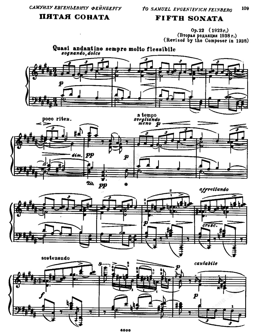 升g小调第五钢琴奏鸣曲 Piano No.5 in Minor Op.22《升g小调第五钢琴奏鸣曲》Piano No.5 in Minor Op.22 ,作于1923年,于1938年修订,仅有两个乐章,其中第二乐章是以变奏曲的形式出现:第一乐章,非常柔和而有弹性的近似小行板的速度,升g小调,3/4拍。第二乐章“变奏曲” ,主题是平静的降A大调,随后是十个变奏和尾声。其中第九变奏为一个较长的赋格。