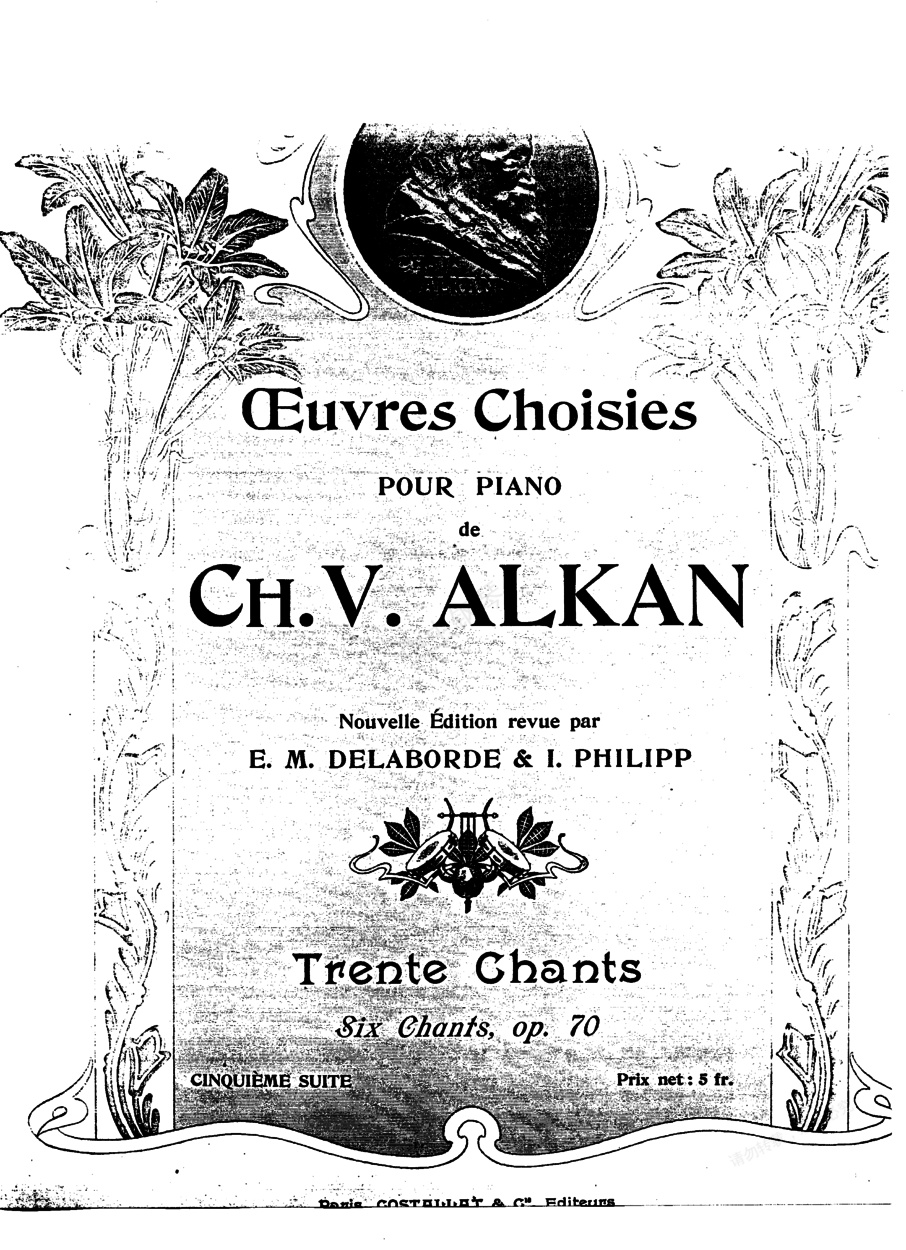 第五号迷人的歌ème de Op.70《第五号迷人的歌》ème de Op.70 ,作于1872年,为纪念于1870年逝世的伟大的比利时小提琴演奏家路易斯·德·贝里奥特(Louis de)而作,共由六首小曲组成。1870年,法国为争夺欧洲霸权发动了普法战争,结果惨败。法国面临亡国的危急关头,巴黎人民首先起义推翻了法兰西第二帝国,但民族矛盾激化阶级矛盾再次导致革命的爆发,巴黎人民坚决地选择了武装斗争的方式,再次掀起革命,建立了巴黎公社。在当时情况下,阿尔坎写信给他的挚友费迪南德·休勒():“49个昼夜里,我一直生活在没有停息过的枪炮声中。我只能在钢琴上用琴声给他们以痛击。”虽然阿尔坎最后活到1888年,甚至还再次返回音乐会舞台上,但这组《第五号迷人的歌》却几乎成为他创作的最后一部钢琴作品。1. 可爱的二重唱 ,E大调,4/4拍,如歌的甚慢板。双手交替演奏的旋律声部和分解和弦伴奏声部相辅相成,在二重唱声部同时进行时更达到了完美的统一。这也是另一位法国作曲家福雷在1880年后惯用的创作手法之一。2. 小行板 ,a小调,三部曲式,左手3/4拍,粗犷地演奏柱状和弦进行的伴奏,右手为2/4拍,演奏非常连贯的旋律,令人联想到哈姆雷特的台词“这是一个颠倒混乱的时代,唉,倒楣的我却要负起重整乾坤的责任!”The time is out of joint: O spite, That ever I was born to set it right! 。中段转入生动的A大调,这是风一般转瞬即逝的肖邦风格。3. 活泼的快板 ,A大调,2/4拍,三部曲式。主部带随想曲风格,节奏紧凑,跟《第一号迷人的歌》Op.38a 中的第三首《圣咏》有相似之处。中段是温柔如歌的。其辉煌的尾声达到全曲的高潮。在整体上,这首作品预示着埃尔加的《威风凛凛进行曲》的产生。4. 音乐之声 La voix de l' ,A大调,4/4拍,甜美如歌的。象是为大提琴而作的旋律在钢琴的中音区吟唱,偶尔出现的和弦就像是弹拨乐器所作的伴奏。5. 谐谑圣咏调 ,升f小调,3/4拍,最急板。主部的急躁让人有喘不过气的感觉。在中部的谱面上标有“教堂三重奏” Trio 字样,转升F大调,以甜美如歌的形式表现,是美得令人落泪的音符组成。 * 回顾 ,这个宛如间奏曲的“重温”部分将前面出现过的五首作品的片断组合在一起,最终进入这部作品的最后一首曲子《船歌》。6. 船歌 ,g小调,6/8拍,沉痛的行板。这是阿尔坎最后的一首船歌,从其规模上和深度上可以看出,这是他同类作品中最优秀者。
