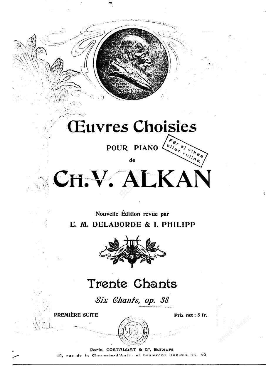 第一号迷人的歌 de Op.38a阿尔坎的《三十首迷人的歌》 是他的代表作之一,共分为五个组曲出版。上面已经介绍过他这部作品中最著名的《第三号迷人的歌》Op.65,这里要介绍的是《第一号迷人的歌》 de Op.38a ,作于1857年,于1860年出版,也是由六首小曲组成。1. 甚快板 Assez ,E大调,4/4拍,尽管是快速的,旋律也应保持宽广。2. 小夜曲 ,a小调,2/4拍,甚快的小快板。3. 圣咏 ,A大调,6/8拍,快板。4. 圣祭 L' ,A大调,4/4拍,小行板。5. 躁动 ,升f小调,右手4/4拍,左手24/16拍,最急板。6. 船歌 ,g小调,6/8拍,行板。