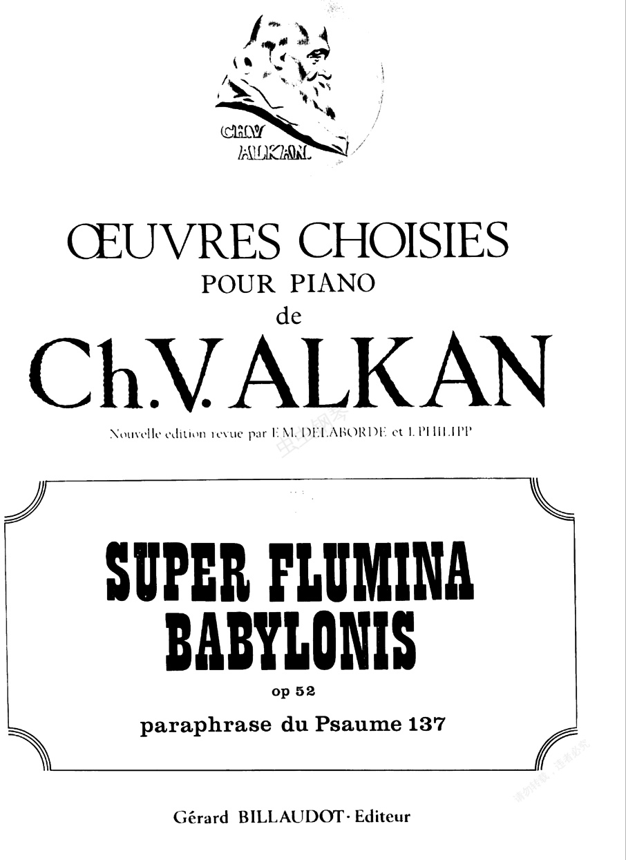 巴比伦河畔 Super Op.52《巴比伦河畔》Super Op.52 ,根据第137号诗篇而作,作于1859年。第137号诗篇所表达的是被囚禁多年的犹太人来到巴比伦河畔所抒发的内心的悲叹。阿尔坎根据此诗篇写成这首富于戏剧性的作品,反映出他对圣诗的喜好。作品为g小调,开头为4/4拍,近似柔板的速度,宛如竖琴般宁静的音响,接着经过甚活泼的12/8拍,稍平静后,转入第二部分3/4拍的激烈的快板,最终结束全曲。