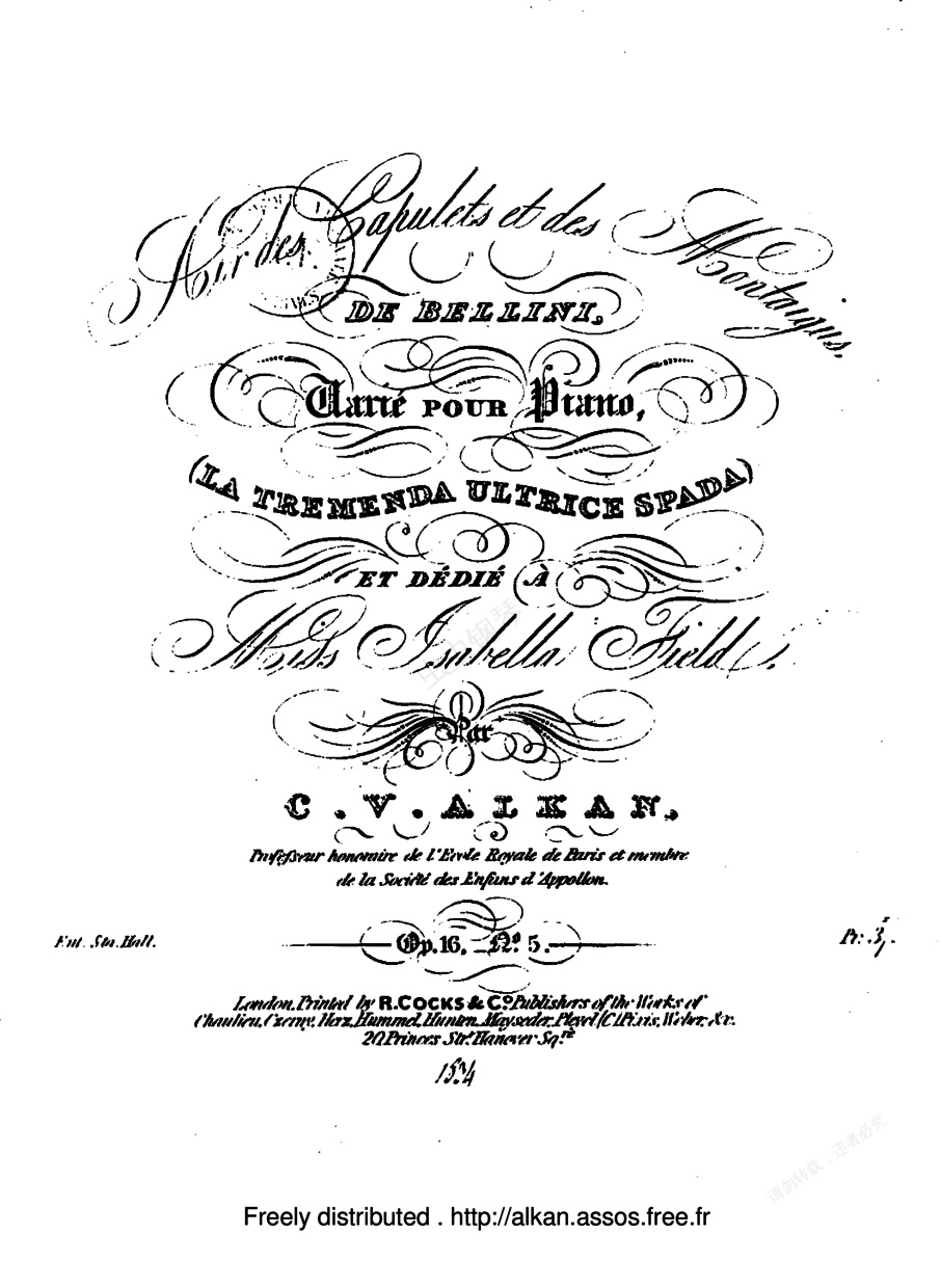3首变奏曲 3 Op.16 No.4-6《三首变奏曲》Trois Op.16 No.4-6 ,于1834年出版。阿尔坎被编号为Op.16 的作品共有三组,它们分别是:《六首个性小品》Sixé 、《三首华丽练习曲》和《三首变奏曲》。其中《六首个性小品》再版的时候重新编号为Op.8 ,最终合并到由十二首个性小品组成的钢琴套曲《四季》Les Mois Op.74 中;《三首华丽练习曲》则成为Op.16 的前三首,《三首变奏曲》成为Op.16 的后三首。1. 多尼采蒂主题变奏曲 sur Ah ! é la mia morte de l'Opéra Anna de ,题献给罗德夫人(H. G. Le Loder)。D大调,根据多尼采蒂的歌剧《安娜·波列娜》Anna 中的“啊!这显然是要我去死”Ah ! é la mia morte 主题而作。由引子、主题、三个变奏和终曲组成。2. 贝里尼主题变奏曲 sur un Thème de La spada de I e I ,题献给伊莎贝拉·菲尔德小姐( Field)。G大调,根据贝里尼的歌剧《凯普列与蒙太奇家族》I e I 中的“可怕的复仇之剑”La spada 主题而作。由引子、主题、四个变奏和终曲组成。3. 那不勒斯船歌主题幻想变奏曲 sur une ,题献给玛丽·温莎小姐(Mary)。降B大调,根据一首那不勒斯船歌主题而作。由引子、主题、三个变奏和终曲组成。