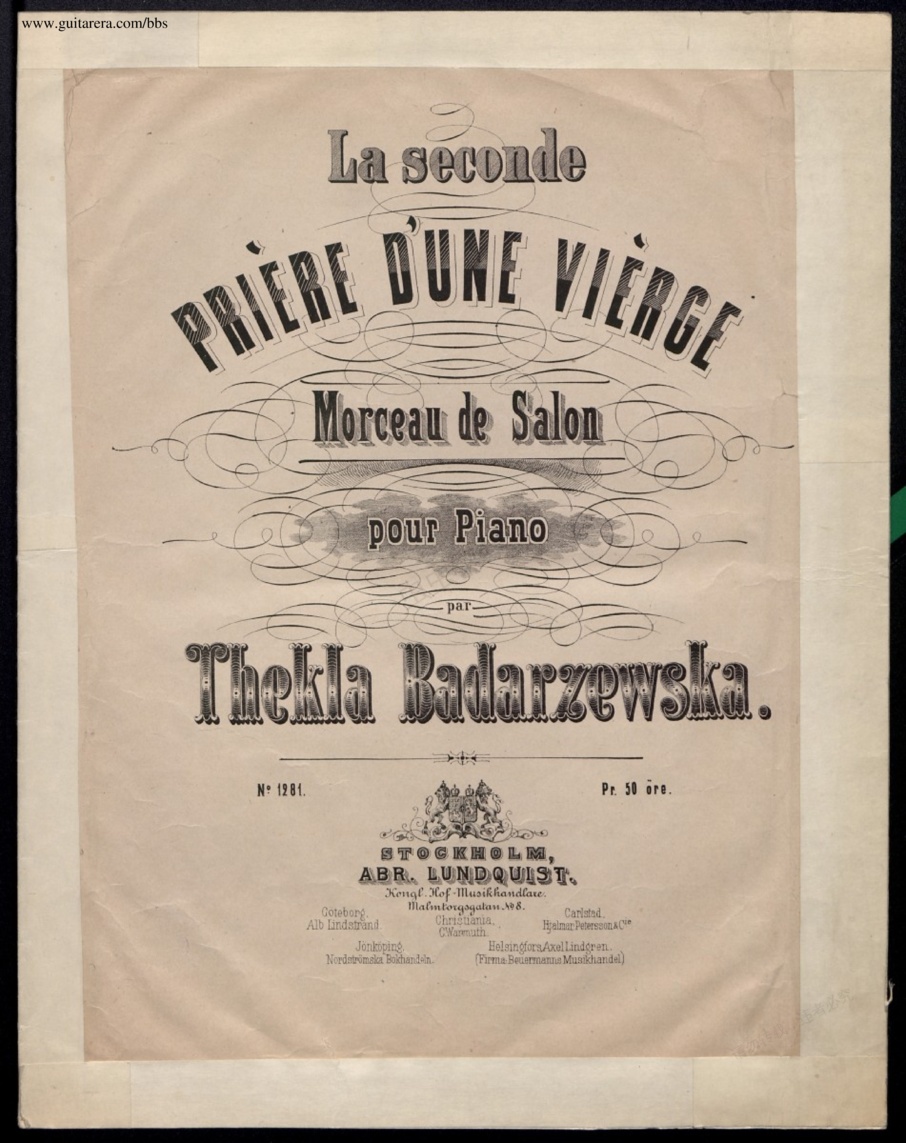少女的祷告 La d'une《少女的祷告》La d'une ,又称“第二号少女的祈祷”,作于1852年,于1888年出版。众人皆知芭达捷芙丝卡的钢琴名作《少女的祈祷》,但却甚少人知晓她还作有另一首《少女的祈祷》,也就是这首《少女的祷告》(为了区分两首作品,将此作翻译成“少女的祷告”)。这首作品为降B大调,4/4拍,同样以变奏曲的形式写成,由主题和四个变奏组成。主题为虔诚的行板;第一变奏是经过华丽装饰的主题变形;第二变奏以g小调双音呈示,流露出淡淡的哀愁;第三变奏回到降B大调,在中音区低声吟唱;第四变奏以和弦展现,结束全曲。整体来看也不失为一首迷人的钢琴小品。