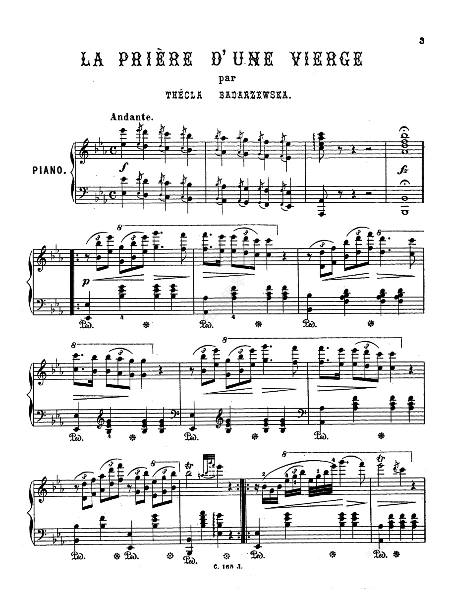 少女的祈祷 Gebet einer Op.4《少女的祈祷》The's Op.4 这首钢琴小曲作于1851年,最早于1856年刊登在法国巴黎一家音乐杂志的副刊上,但很快就不胫而走,成为畅销一时的名曲,此后相继以八十余种不同版本风行全球。这支曲子,不仅流传于波兰和欧洲和国,在美洲、亚洲、非洲和太平洋各国也广为人知。《少女的祈祷》的乐谱,现在已有上百种版本,遍及世界各地。有人把它改编成四手联弹、八手联弹或其它形式的器乐曲,甚至还有人给它填词,把它改编成歌曲来演唱。目前流行的钢琴曲《少女的祈祷》主要有两种版本,一种是理查德-克莱德曼弹奏的改编版,一种是纯正的钢琴独奏版。我们经常听到的几乎都是查德-克莱德曼演奏版,后者听到的不多。乐曲的结构极其简单,为速度适中的行板,降E大调,4/4拍子。以下行音为中心的四小节前奏之后,乐曲呈现出温婉而幽丽的主题;此后是主题的四种变奏,第一变奏,右手加有许多装饰音,显得十分华丽,但伴奏部分则比较规矩;第二变奏主题移动左手,在中音区演奏;第三变奏,主题仍由右手担任,它和第一变奏有些近似的地方,但某些音型上有变化;第四变奏用八度音来演奏三连音,感情比较激动。上面谈到的四个变奏,前三个变奏都有反复,第四变奏只有八小节,没有反复。它把乐曲推向高潮,最后用一个主和弦的长音结束全曲,饱含热情。本曲形象单纯、手法朴素,在演奏技巧上难度不大,曲中左手所弹的和声十分简单,只是一些属七和弦和主三和弦而已,初学者即可弹奏。俄国杰出的文学家契诃夫曾在他的著名剧作《三姐妹》中引用此曲作为配乐。乐曲琶音式的上行下行,波浪式的旋律起伏,抒发了她的祈求和激动。音乐在单纯中显出深刻,亲切、伤感、柔美。有些人觉得《少女的祈祷》从艺术性和技巧性来讲都不算高,作为独奏曲过于简单了。可是,不少著名音乐家对它还是很欣赏的,他们喜爱它那动听的旋律和朴实的情感。象俄罗斯著名作曲家穆索尔斯基就很推崇这首钢琴小曲。初学钢琴的人,更是乐于弹奏,因为它比较容易掌握。