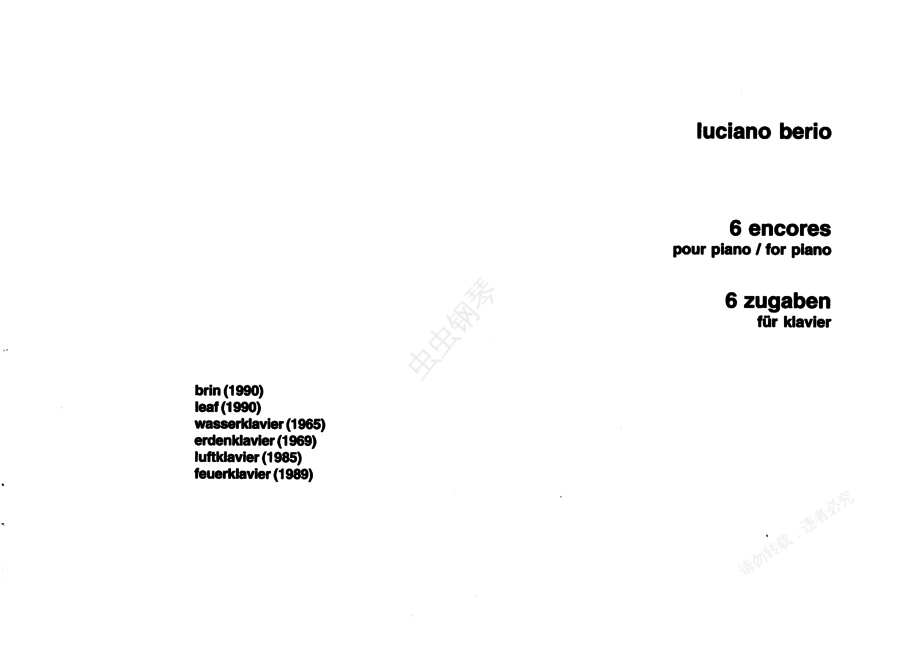 6首返场曲 6 pour piano《六首返场曲》Six pour piano ,是由贝里奥于1965-1990年间创作的六首钢琴短曲组成的曲集。1. 金 Brin ,完成于1990年2月,题献给米歇尔·奥达( Oudar),无小节线和拍号。2. 木 Leaf ,完成于1990年4月17日,为纪念米歇尔·维纳( Vyner)而作,2/4拍。3. 水 ,完成于1965年9月,题献给安东尼奥·巴利斯塔(),f小调,6/8拍,连贯的。晚期浪漫主义风格。4. 土 ,完成于1969年,题献给汤姆斯·维利斯(),无小节线和拍号。5. 空气 ,完成于1985年,无小节线和拍号。6. 火 ,完成于1989年,题献给彼得·塞尔金(Peter),无小节线和拍号。