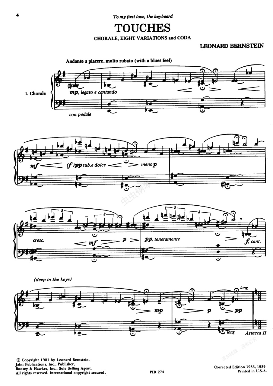 感触《感触》 ,为独奏钢琴而作,副标题为“圣咏、变奏与终曲”, Eight and Coda ,于1980年7月完成,乐谱上的献辞为伯恩斯坦亲笔所提:“献给我的初恋——钢琴”。这是一首现代风格作品,如副标题所示分成三部分:1. 圣咏 ,节奏自由而带有布鲁斯风格的行板,无拍号,标以G大调。2. 变奏一 Var.1 ,活泼的,3/8拍。3. 变奏二 Var.2 ,速度保持不变,2/2拍。4. 变奏三 Var.3 ,更快的,2/4拍。5. 变奏四 Var.4 ,甚快的中板-谐谑风格,4/4拍。6. 变奏五 Var.5 ,小广板,5/8拍。7. 变奏六 Var.6 ,中速的行板,12/8(右)+4/4(左)。8. 变奏七 Var.7 ,甚快板,4/4拍。9. 变奏八 Var.8 ,活泼的,速度同变奏一,3/8拍。10. 终曲 Coda ,广板,6/4拍。