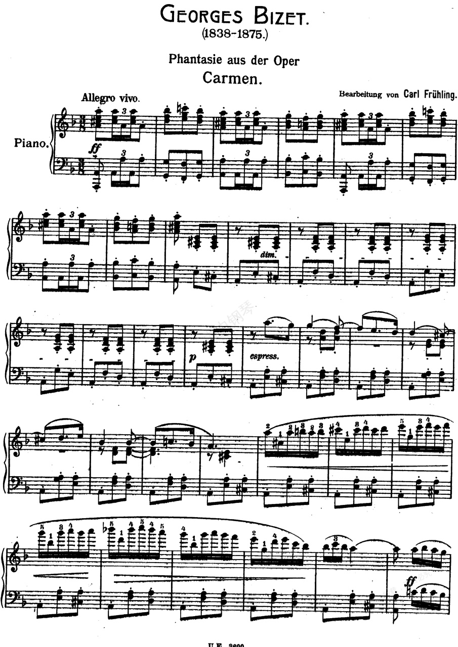 卡门歌剧《卡门》 完成于1874年秋,是比才的最后一部歌剧,也是当今世界上上演率最高的一部歌剧。 梅尔哈克和阿勒维根据梅里芙的同名小说改编。1875年初次演出于巴黎。剧情:烟厂女工卡门是一个漂亮而性格坚强的吉卜赛姑娘。她爱上了军曹霍赛,运用自己罕有的女性魅力使霍塞陷入情网。霍塞不但因此舍弃了原来的情人——温柔而善良的米卡埃拉,而且因放走了与人打架的卡门而被捕入狱,后来甚至与上司祖厄加少校拔刀相见,不得不离开军队,加入卡门所在的走私贩行列。但此时卡门却早已与斗牛士埃斯卡米里奥海誓山盟了。于是导致霍塞与埃斯卡米里奥之间的决斗。决斗中卡门又明显地袒护斗牛士,更使霍塞难以忍受。随即盛大而热烈的斗牛场面开始了,正当卡门为埃斯卡米里奥的胜利而欢呼时,霍塞找到了她。倔强的卡门断然拒绝了他的爱情,最后终于死在霍塞的剑下。 本剧以女工、农民出身的士兵和群众为主人公, 这一点,在那个时代的歌剧作品中是罕见的、可贵的。也许正因为作者的刻意创新,本剧在初演时并不为观众接受,但随着时间的推移,这部作品的艺术价值逐渐得到人们的认可,此后变得长盛不衰。这部歌剧以合唱见长,剧中各种体裁和风格的合唱共有十多部。 歌剧的序曲为A大调,四二拍子,回旋曲式。整部序曲建立在具有尖锐对比的形象之上,以华丽、紧凑、引人入胜的音乐来表现这部歌剧的主要内容。序曲中集中了歌剧内最主要的一些旋律,而且使用明暗对比的效果将歌剧的内容充分地表现了出来,主题选自歌剧最后一幕中斗牛士上场时的音乐。 本剧的序曲是音乐会上经常单独演奏的曲目。第一幕中换班的士兵到来时,一群孩子在前面模仿着士兵的步伐开路。孩子们在轻快的2/4拍子,d小调上,唱着笛鼓进行曲《我们和士兵在一起》。在这一幕塑造了吉卜赛姑娘卡门热情、奔放、富于魅力的形象。主人公卡门的著名咏叹调《爱情像一只自由的小鸟》是十分深入人心的旋律,行板、d小调转F大调、2/4拍子,充分表现出卡门豪爽、奔放而富有神秘魅力的形象。 卡门被逮捕后,龙骑兵中尉苏尼哈亲自审问她,可她却漫不经心地哼起了一支小调,此曲形象地表现出卡门放荡不羁的性格。还是这一幕中,卡门在引诱唐·豪塞时,又唱出另一个著名的咏叹调,为快板、3/8 拍子,是一首西班牙舞蹈节奏的迷人曲子,旋律热情而又有几分野气 , 进一步刻画了卡门性格中的直率和泼辣。 第一幕与第二幕之间的间奏曲也十分有名, 选自第二幕中 唐·豪塞的咏叹调《阿尔卡拉龙骑兵》,大管以中庸的快板奏出洒脱而富活力的主旋律。第二幕中还有一段吉普赛风格的音乐, 表现的是两个吉普赛女郎在酒店跳舞时纵情欢乐的场面,跳跃性的节奏和隐约的人声烘托出酒店里喧闹的气氛。第二幕与第三幕之间的间奏曲是一段轻柔、优美的旋律,长笛与竖琴交相辉映,饱含脉脉的温情。 第三幕中著名的 《斗牛士之歌》,是埃斯卡米里奥为感谢欢迎和崇拜他的民众而唱的一首歌曲。这首节奏有力、声音雄壮的凯旋进行曲,成功地塑造了这位百战百胜的勇敢斗牛士的高大形象。 第四幕的结尾,正象柴科夫斯基所说的那样: “当我看这最后一场时,总是不能止住泪水,一方面是观众看见斗牛士时的狂呼,另一方面却是两个主人公最终死亡的可怕悲剧结尾,这两个人不幸的命运使他们历尽辛酸之后还是走向了不可避免的结局。” 剧中还有一段脍炙人口的西班牙风格舞曲“阿拉贡”, 也是音乐会上经常单独演出的曲目。《卡门序曲》,是该歌剧中最著名的器乐段落,常被人们称为“斗牛士进行曲”,常单独演奏。一般的歌剧序曲都是用交响方式缩写或提示歌剧内容,这首序曲结构简单,仅仅描写了欢乐气氛和剧中次要人物斗牛士的英勇形象。开始呈示的快板主题选自歌剧第四幕斗牛士上场时的音乐,生气勃勃、充满活力,表现了斗牛士英武潇洒的形象和斗牛场内兴奋活跃的气氛。由于它带有进行曲特点,故又称《斗牛士进行曲》。接下来乐曲从A大调转为F大调,出现第二幕中《斗牛士之歌》的副歌音调,具有凯旋进行曲特点,坚定有力的节奏和威武雄壮的曲调表现了斗牛士的飒爽英姿。反复时提高八度,使情绪显得更为高昂。之后再现第一部分主题。结束部分出现卡门的音乐动机,带有不祥的气氛,在弦乐有力的震音背景下,以大提琴为主的乐器奏曲悲剧性主题,暗示悲剧性的结局,最后在强烈的不和协音响中结束。