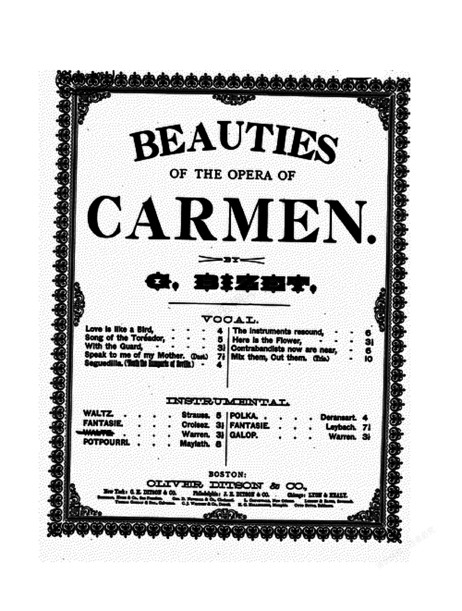 卡门歌剧《卡门》 完成于1874年秋,是比才的最后一部歌剧,也是当今世界上上演率最高的一部歌剧。 梅尔哈克和阿勒维根据梅里芙的同名小说改编。1875年初次演出于巴黎。剧情:烟厂女工卡门是一个漂亮而性格坚强的吉卜赛姑娘。她爱上了军曹霍赛,运用自己罕有的女性魅力使霍塞陷入情网。霍塞不但因此舍弃了原来的情人——温柔而善良的米卡埃拉,而且因放走了与人打架的卡门而被捕入狱,后来甚至与上司祖厄加少校拔刀相见,不得不离开军队,加入卡门所在的走私贩行列。但此时卡门却早已与斗牛士埃斯卡米里奥海誓山盟了。于是导致霍塞与埃斯卡米里奥之间的决斗。决斗中卡门又明显地袒护斗牛士,更使霍塞难以忍受。随即盛大而热烈的斗牛场面开始了,正当卡门为埃斯卡米里奥的胜利而欢呼时,霍塞找到了她。倔强的卡门断然拒绝了他的爱情,最后终于死在霍塞的剑下。 本剧以女工、农民出身的士兵和群众为主人公, 这一点,在那个时代的歌剧作品中是罕见的、可贵的。也许正因为作者的刻意创新,本剧在初演时并不为观众接受,但随着时间的推移,这部作品的艺术价值逐渐得到人们的认可,此后变得长盛不衰。这部歌剧以合唱见长,剧中各种体裁和风格的合唱共有十多部。 歌剧的序曲为A大调,四二拍子,回旋曲式。整部序曲建立在具有尖锐对比的形象之上,以华丽、紧凑、引人入胜的音乐来表现这部歌剧的主要内容。序曲中集中了歌剧内最主要的一些旋律,而且使用明暗对比的效果将歌剧的内容充分地表现了出来,主题选自歌剧最后一幕中斗牛士上场时的音乐。 本剧的序曲是音乐会上经常单独演奏的曲目。第一幕中换班的士兵到来时,一群孩子在前面模仿着士兵的步伐开路。孩子们在轻快的2/4拍子,d小调上,唱着笛鼓进行曲《我们和士兵在一起》。在这一幕塑造了吉卜赛姑娘卡门热情、奔放、富于魅力的形象。主人公卡门的著名咏叹调《爱情像一只自由的小鸟》是十分深入人心的旋律,行板、d小调转F大调、2/4拍子,充分表现出卡门豪爽、奔放而富有神秘魅力的形象。 卡门被逮捕后,龙骑兵中尉苏尼哈亲自审问她,可她却漫不经心地哼起了一支小调,此曲形象地表现出卡门放荡不羁的性格。还是这一幕中,卡门在引诱唐·豪塞时,又唱出另一个著名的咏叹调,为快板、3/8 拍子,是一首西班牙舞蹈节奏的迷人曲子,旋律热情而又有几分野气 , 进一步刻画了卡门性格中的直率和泼辣。 第一幕与第二幕之间的间奏曲也十分有名, 选自第二幕中 唐·豪塞的咏叹调《阿尔卡拉龙骑兵》,大管以中庸的快板奏出洒脱而富活力的主旋律。第二幕中还有一段吉普赛风格的音乐, 表现的是两个吉普赛女郎在酒店跳舞时纵情欢乐的场面,跳跃性的节奏和隐约的人声烘托出酒店里喧闹的气氛。第二幕与第三幕之间的间奏曲是一段轻柔、优美的旋律,长笛与竖琴交相辉映,饱含脉脉的温情。 第三幕中著名的 《斗牛士之歌》,是埃斯卡米里奥为感谢欢迎和崇拜他的民众而唱的一首歌曲。这首节奏有力、声音雄壮的凯旋进行曲,成功地塑造了这位百战百胜的勇敢斗牛士的高大形象。 第四幕的结尾,正象柴科夫斯基所说的那样: “当我看这最后一场时,总是不能止住泪水,一方面是观众看见斗牛士时的狂呼,另一方面却是两个主人公最终死亡的可怕悲剧结尾,这两个人不幸的命运使他们历尽辛酸之后还是走向了不可避免的结局。” 剧中还有一段脍炙人口的西班牙风格舞曲“阿拉贡”, 也是音乐会上经常单独演出的曲目。《卡门序曲》,是该歌剧中最著名的器乐段落,常被人们称为“斗牛士进行曲”,常单独演奏。一般的歌剧序曲都是用交响方式缩写或提示歌剧内容,这首序曲结构简单,仅仅描写了欢乐气氛和剧中次要人物斗牛士的英勇形象。开始呈示的快板主题选自歌剧第四幕斗牛士上场时的音乐,生气勃勃、充满活力,表现了斗牛士英武潇洒的形象和斗牛场内兴奋活跃的气氛。由于它带有进行曲特点,故又称《斗牛士进行曲》。接下来乐曲从A大调转为F大调,出现第二幕中《斗牛士之歌》的副歌音调,具有凯旋进行曲特点,坚定有力的节奏和威武雄壮的曲调表现了斗牛士的飒爽英姿。反复时提高八度,使情绪显得更为高昂。之后再现第一部分主题。结束部分出现卡门的音乐动机,带有不祥的气氛,在弦乐有力的震音背景下,以大提琴为主的乐器奏曲悲剧性主题,暗示悲剧性的结局,最后在强烈的不和协音响中结束。