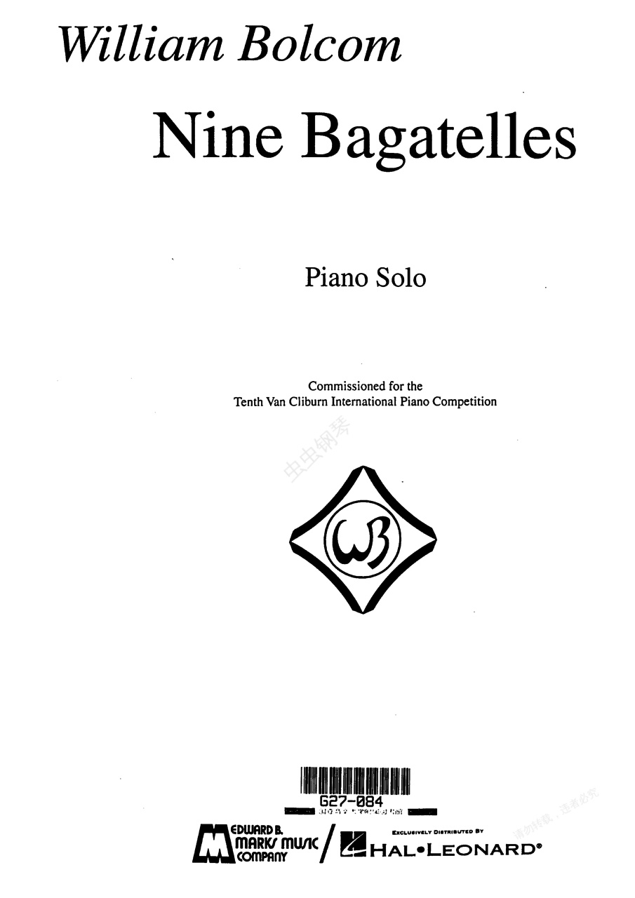 9首小品 9《九首小品》Nine ,是博尔科姆应第十届范·克莱本国际钢琴比赛(Tenth Van Piano)之邀于1996年创作的一组参赛曲集。作品标题均标在乐曲的结尾部。1. 灵歌玛祖卡 The Ghost ,3/4拍,生动而有节奏的。2. 爱之梦 un Rêve? ,稍自由和轻盈的甚慢板。3. 被遗忘的祷文 ,2/2拍,辽阔的快板-柔板。4. 环游世界 Cycle de l' ,3/8拍,持续不变的。5. 美丽的红发女郎 La Belle ,D大调,4/4拍,朴素而抒情的。6. 天马 ,无小节线,最急板。7. 午夜 The ,6/8拍,行板。8. 地狱深处 in Hell ,3/4拍,非常精巧而不过分的快板。9. 马戏团加洛普舞曲 Galop ,2/4拍,严谨的快板进行曲。