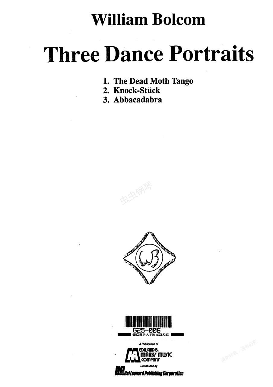 3首舞蹈肖像 Three Dance《三首舞蹈肖像》Three Dance ,作于1986年。这是博尔科姆用舞曲体裁为他的钢琴家朋友们而作的音乐肖像。1. 死亡飞蛾探戈 The Dead Moth Tango ,题献给著名指挥家丹尼斯·鲁塞尔·戴维斯(),其灵感来源于一只偶然被博尔科姆打死的飞蛾,带阿根廷和巴西探戈风格,a小调,4/4拍,刻板的葬礼式探戈节奏。2. 踢踏舞小品 Knock Stuck ,题献给天才作曲家柯蒂斯·史密斯(),用钢琴模仿了踢踏舞鞋敲击地板的声音,并使用了柯蒂斯作品中常见的切分音节奏,4/4拍,蹑手蹑脚的踢踏舞滑步节奏。3. 阿巴卡达布拉 ,题献给著名指挥家和作曲家阿巴·布京(Abba Bogin)作为他的生日礼物。 是于1983年在法国电视台演出的由著名的阿巴乐队(ABBA)演奏的以童话故事(如《白雪公主》、《灰姑娘》、《睡美人》等)为主题的法国儿童歌舞音乐,4/4拍,非常有节奏的爵士风格。