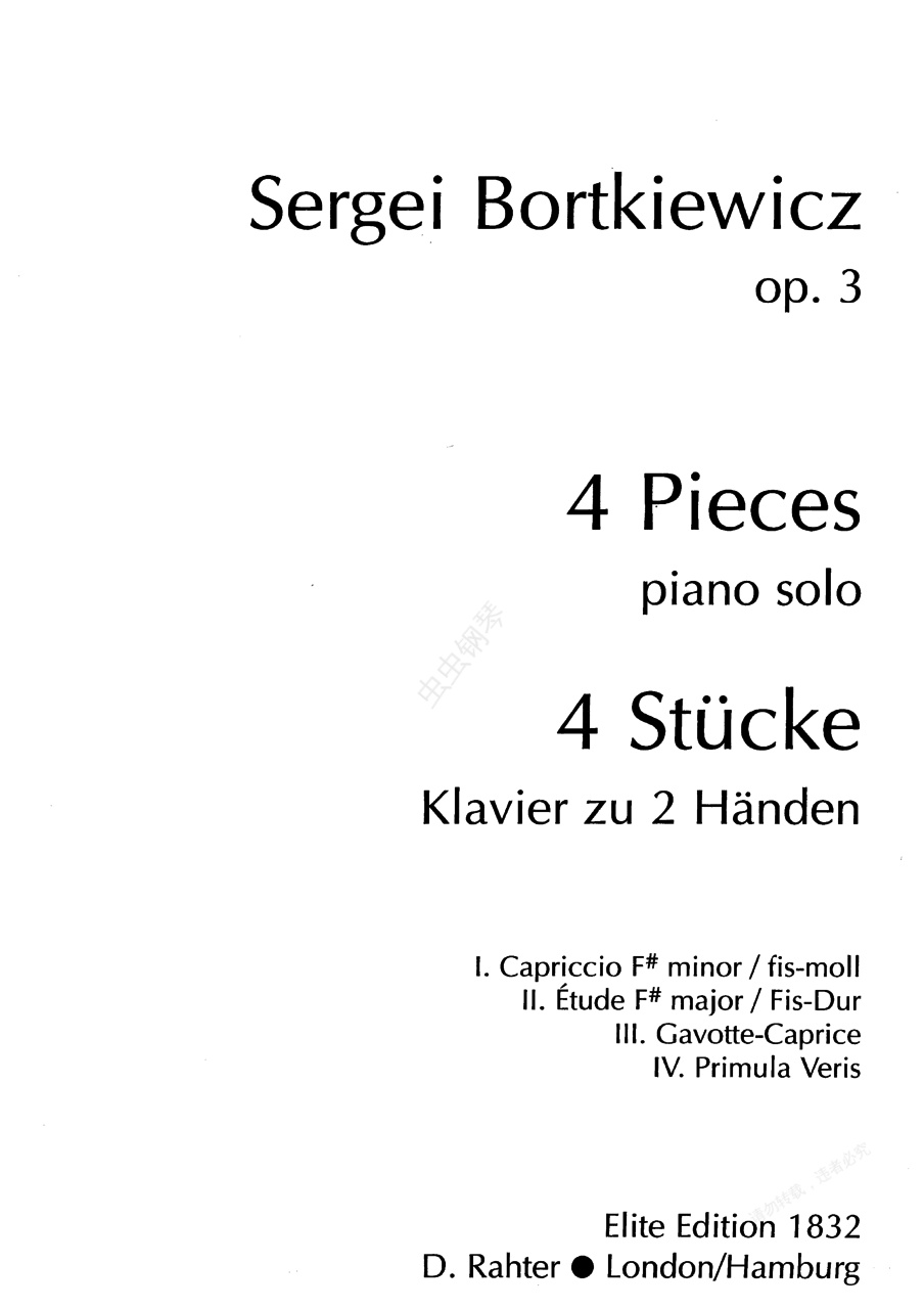 4首小品 Four Op.3《四首小品》 Op.3 ,作于1906年。1. 随想曲 ,题献给他的老师阿尔弗莱德·瑞森瑙尔(),A大调,9/8拍,火热的。2. 升F大调练习曲 Etude in Major ,题献给奥森·萨肯伯爵夫人( d'),升F大调,3/4拍,不过分的快板。双音练习曲。3. 加沃特随想曲 ,题献给他的母亲苏菲亚·波特凯维茨( ),升F大调,4/4拍,小快板。4. 报春花 Veris ,又译“樱草”,题献给朱莉·夏琳(Julie),F大调,6/8拍,甚快的速度。