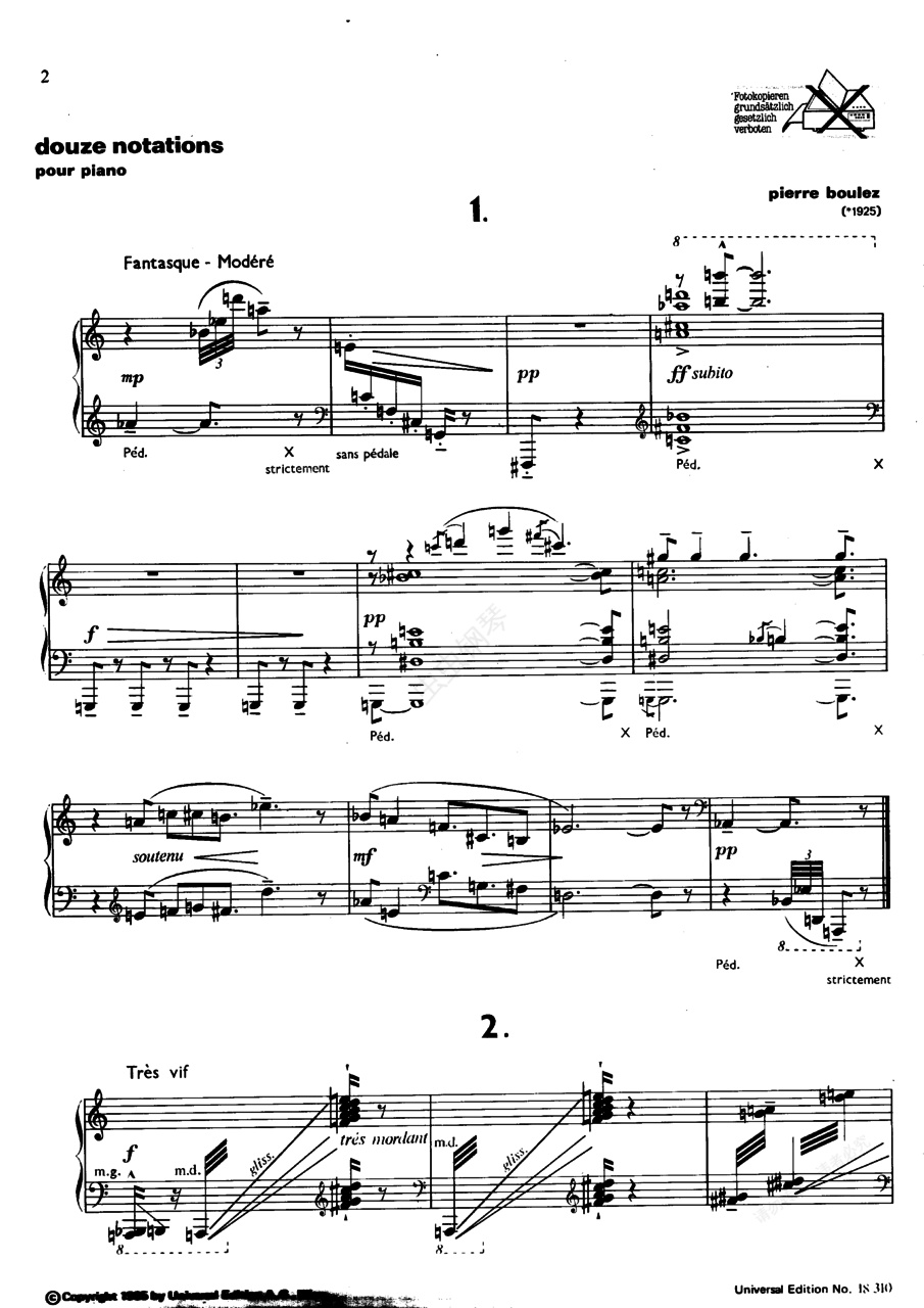 12首乐谱笔记 12布莱兹的表现主义,表现在他对结构的极端追求。他以韦伯恩的后期作品为起点,将勋伯格的系列加以扩展。他认为,“音乐应该成为魔力与歇斯底里的集合”,“这种结合在于对平衡的把握能力”。布莱兹的《乐谱笔记》 从1945年到1978年,共作有十二首,每一首显示不同乐器的组合,实际是他对各种音乐因素组合的一种尝试。从中我们可清楚感受到各种音之间的对比、不谐和发展与它们的平衡,是一种饶有趣味的音乐因素组合的游戏。这种游戏充分表达了布莱兹的独创价值。