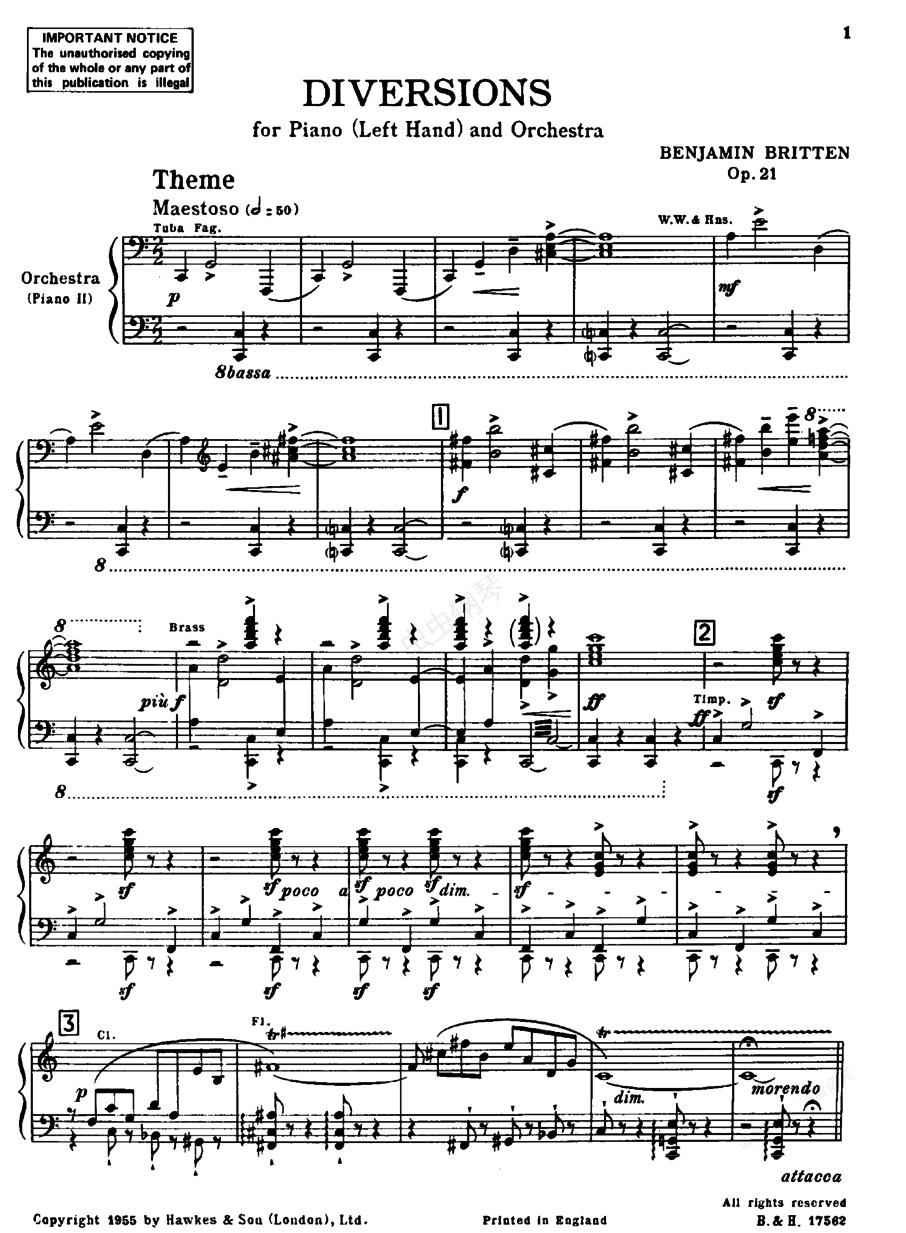 钢琴谱:Diversions for Piano (left hand) and Orchestra op21