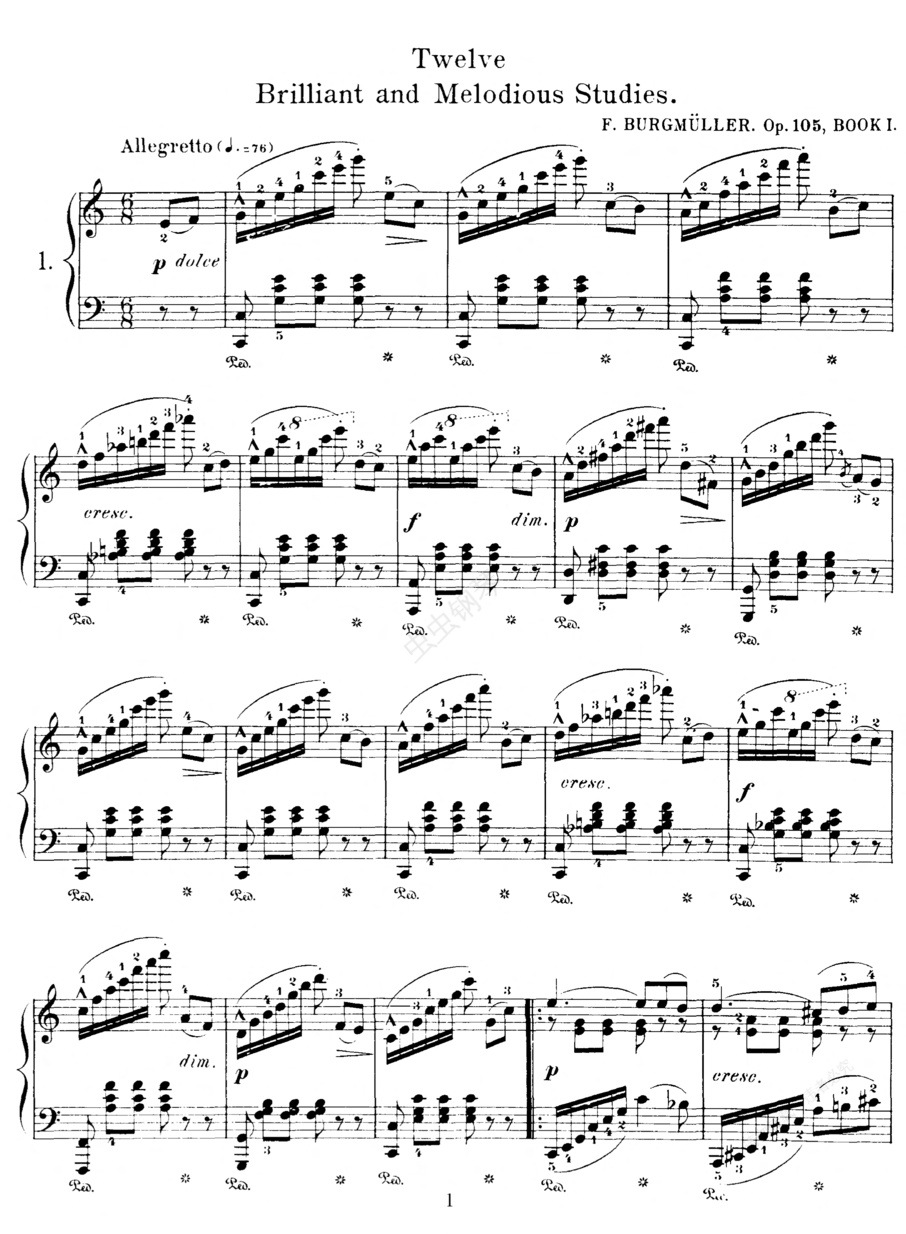 12首华丽优美的钢琴练习曲 Op.105布格缪勒继承了古典主义传统和作曲技法,作品在情调上带有浪漫色彩。《十二首华丽优美的钢琴练习曲》12 and Op.105 是他钢琴练习曲中的代表作。作曲家把弹奏浪漫派乐曲所需要的技巧,以及浪漫派作品的旋律线条的鲜明、微妙的速度变化和精致的力度变化等特征都体现在这本练习曲中。他的练习曲包括了分解琶音、分解八度、前倚音、双音、颤音、同音反复、半音阶、各种音型的断奏及圆滑奏,手指之间的扩大、左手宽音域的跳跃以及和弦连接等,他将这些枯燥的技术课题都融入在练习曲优美的旋律和精致巧妙的织体中。通过弹奏练习,学生既能循序渐地地学习了手指动动的流畅、手指的爆发力、手指的张力、手臂手腕的重要调节能力,及指尖承重感锻炼等钢琴弹奏技巧,同时又能在音乐素质、艺术修养以及综合能力方面有所提高。1. C大调,6/8拍,小快板。琶音练习曲。2. c小调,4/4/拍,激动的快板。双手齐奏和跳音练习曲。3. F大调,4/4拍,快板。半音阶练习曲。4. D大调,4/4拍,行板。手指扩张练习曲。5. 降B大调,3/8拍,快板。托卡塔风格练习曲。6. G大调,3/4拍,行板。震音练习曲。7. d小调,2/4拍,活泼的快板。跳音练习曲。中段转入如歌的D大调,为八度练习曲。8. A大调,6/8拍,快板。手指灵活练习曲。9. E大调,2/4拍,不过分的快板。八度练习曲。10. a小调,6/8拍,活泼的快板。托卡塔风格练习曲。11. 降A大调,4/4拍,前奏部分为f小调的柔板,震音练习曲。主题为如歌的降A大调,连音和表情练习曲。12. 降E大调,3/4拍,中板。手指灵活练习曲。