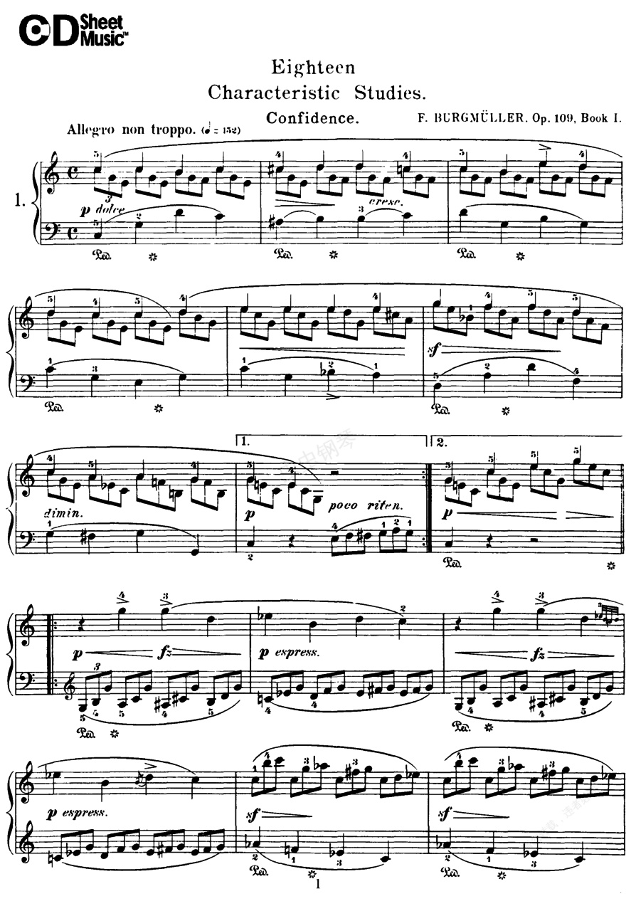 18首性格练习曲 Op.109《十八首性格练习曲》18 Op.109 ,在遍释布格缪勒钢琴练习曲 Op.100 训练要点的基础上,增加了对不同风格、不同体裁作品的文化背景在训练提示中的分量。十八首标题分别是:1.自信 ,C大调,4/4拍,不过分的快板。分解和弦练习曲。2.珍珠 Pears ,C大调,3/4拍,中板。音阶练习曲。3.牧人归途's ,G大调,3/4拍,小快板。手指灵活练习曲。4.吉普赛人 ,c小调,4/4拍,不过分的快板。断奏、连奏练习曲。5.泉水 ,G大调,2/4拍,优雅的行板。震音练习曲。6.快乐的少女 ,C大调,3/8拍,小快板。跳音练习曲。7.摇篮曲 ,F大调,3/8拍,稍快的小行板。琶音练习曲。8.彷徨 ,e小调,4/4拍,生动的快板。托卡塔风格练习曲。9.晨钟 Matin Bell ,降A大调,3/4拍,连贯的行板。有表情的练习曲。10.快步 ,C大调,6/8拍,生动的。音阶练习曲。11.小夜曲 ,a小调,6/8拍,优雅的小快板。倚音练习曲。12.在森林中的觉醒 in the Wood ,F大调,4/4拍,快板。跳音练习曲。13.暴风雨 Storm ,d小调,4/4拍,快板。手指灵活练习曲。14.船歌小叙事诗 Lay of the ,A大调,6/8拍,稍快的小行板。有表情的练习曲。15.风的精灵 ,g小调,3/8拍,生动的。16.离别 ,降E大调,4/4拍,激动的快板。和弦练习曲。17.进行曲 March ,F大调,4/4拍,庄严的快板。跳音练习曲。18.纺织歌 At the wheel ,D大调,4/4拍,中庸的快板。手指灵活练习曲。