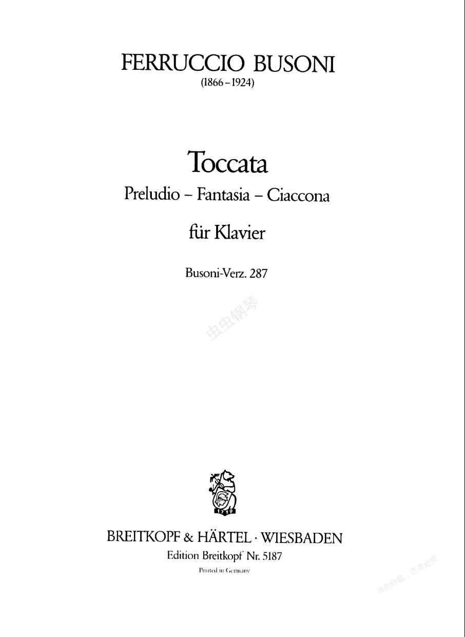 托卡塔 BV 287《托卡塔》 BV 287 ,副标题“前奏曲,幻想曲与恰空”,, ,作于1920-1921年,题献给他的助手雅纳赫·菲利普()。布索尼自身评价“没有人在弹完这首作品前不遇到困难的”Non è senzaá che si al fine. 这就说明这是一首充满挑战性的作品。布索尼的传记作者安东尼·贝欧蒙特()指出,它反映了布索尼在返回柏林后情绪不安的一面("a of the his to.")。作品如副标题所示,分为三部分,其中有引用布索尼其他作品中出现过的音乐素材:第一部分“前奏曲” ,降a小调,6/4拍,精力充沛的甚急板。其主题素材源自布索尼于1912年所作的歌剧《选择新娘》Die 中的“利波德之歌”The of the 。第二部分“幻想曲” ,连贯而甚快的柔板-活泼的小快板-平静的行板-非常生动的。这是一个复杂、变幻莫测的部分。第三部分“恰空” ,降a小调,3/4拍,果断的快板。