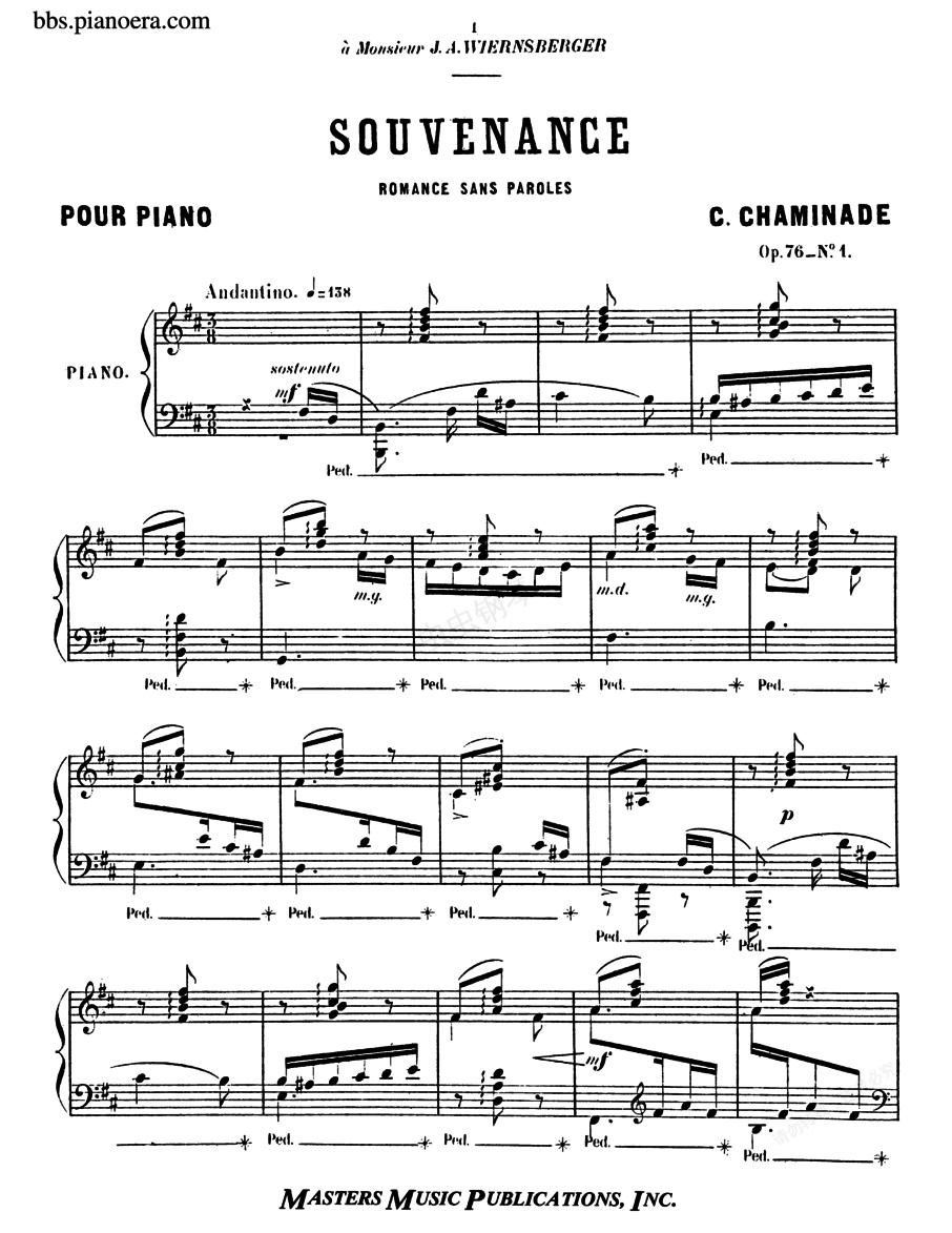 6首无词歌 6 Sans Op.76《六首无词歌》6 Sans Op.76 ,于1893年出版。1. 回忆,b小调,3/8拍,小行板,题献给简·奥古斯特·韦恩斯贝尔格先生(Jean Jules)。2. 鼓舞,E大调,6/8拍,稍快的行板,题献给保罗·兰道夫斯基博士(Paul)。3. 牧歌,e小调,4/4拍,中庸的快板,题献给亨利·凯撒先生(Henri)。4. 田园诗 ,降G大调,3/4拍,中板,题献给乔治·法尔肯贝格先生()。5. 布列塔尼之歌,d小调,6/8拍,果断的快板,题献给沃斯特先生()。6. 冥想曲,降A大调,2/2拍,慢板。题献给查尔斯·雷纳先生( René)。