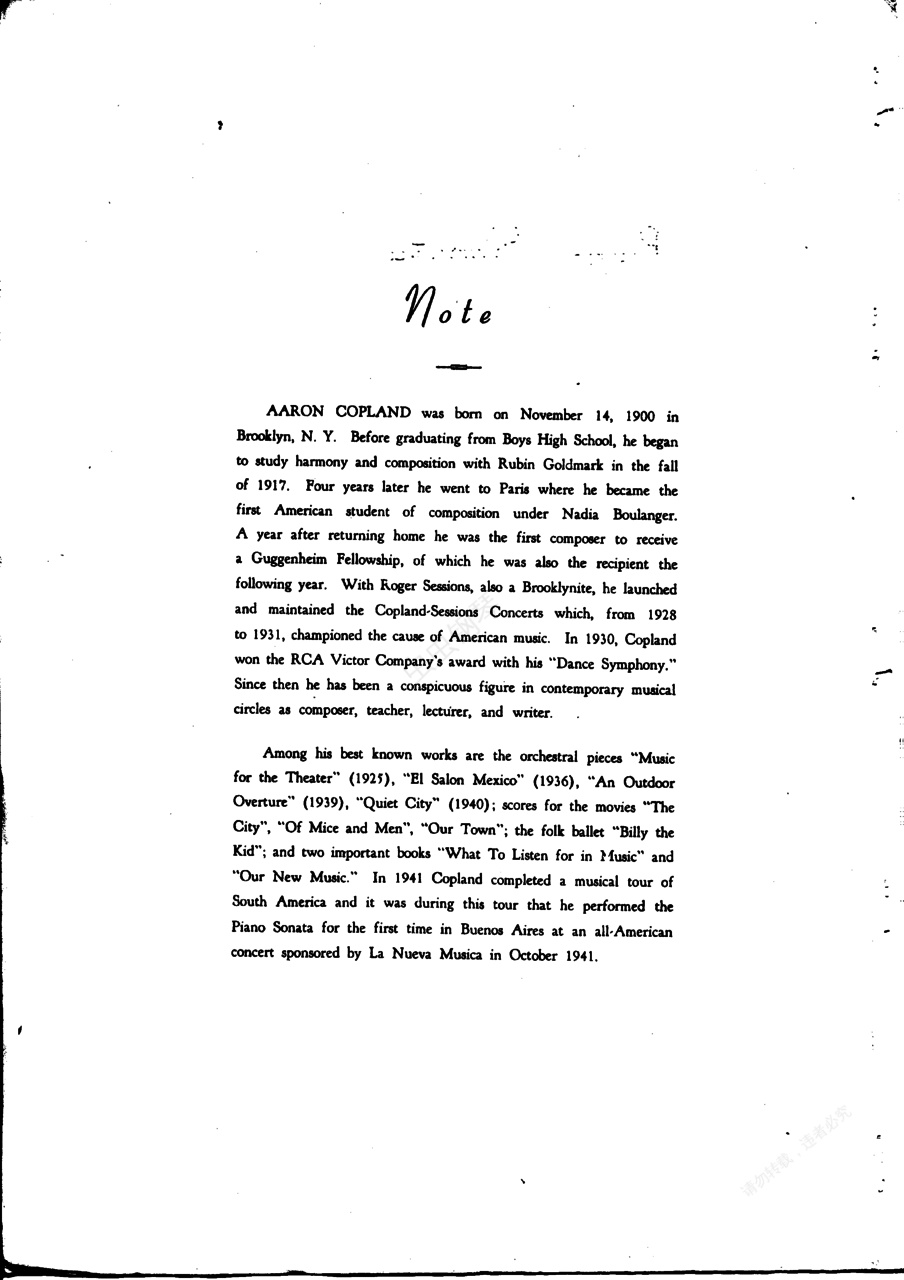 钢琴奏鸣曲 Piano《钢琴奏鸣曲》Piano 创作于1939-1941年间,是科普兰在成功地创作和演出两部舞剧《小伙子比利》和《寂静的城市》的两年后而写的,并于1941年由作曲家亲自在布宜诺斯艾利斯首演。该曲无疑是20世纪中一部重要的钢琴独奏作品。全曲分为三个乐章,运用慢-快-慢这种典型的20世纪奏鸣曲的形式。第一乐章,甚中板,以两个具有强烈的格言的意思开始,以开始的动机作为主题旋律线,另一个基本形象是建立在奏鸣曲式的形式上。第二乐章,活泼地,这是一个带有爵士乐风格的诙谐曲。它的灵感来自于作曲家早年对某些东西敏感的想法。第三乐章,持续的行板,节奏与和声如同第一乐章的延伸。不过在速度上比一乐章更慢。