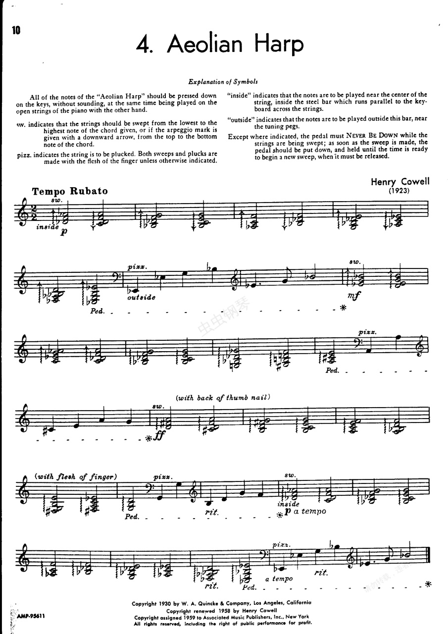 风鸣琴 Harp《风鸣琴》 Harp ,又译“风奏琴”,作于1923年,是考威尔早期创新和试验性创作的代表作之一。1911-1936年为考威尔的早期创作,是创新和试验期,在此期间,他创作的一些钢琴曲要求演奏者在琴上用手指、拳头或胳膊弹奏全音或半音构成的音簇,后又发明打开琴盖,在琴弦上直接拨弦或用刷子刷弦、手指压弦及敲击琴弦等方法。这首《风鸣琴》在演奏上要求一只手按下琴键不出声,另一只手伸到琴弦上进行拨奏。它与《狺女》、《邪恶的共鸣》的创作,促使考威尔进一步想到在钢琴琴弦之间置放汤匙、铅笔等异物以造成新音色的可能性,为后来凯奇的“加料钢琴”试验奠定了基础。