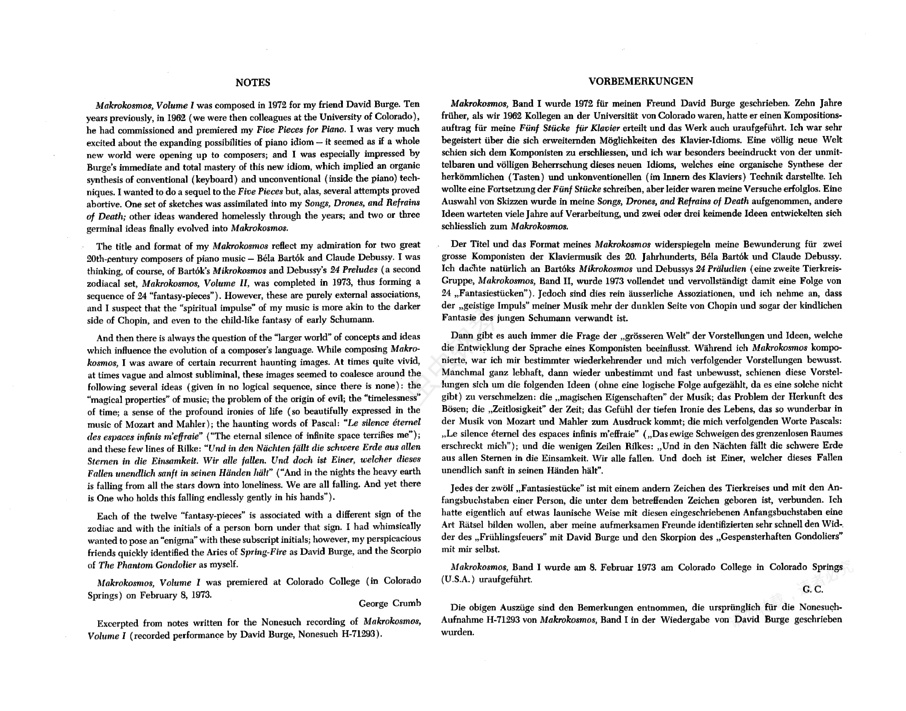 大宇宙(第一卷) I克拉姆是美国新音色音乐和音乐神秘主义的主要代表,他将后印象主义、新浪漫主义、机遇音乐、新创音色等冶于一炉,创造出属于自己的独特风格。他的钢琴音乐代表作之一就是为电扩声钢琴( Piano, 又称“电声钢琴”、“电声扩大钢琴”)演奏而作的四卷钢琴套曲《大宇宙》 。它采用了极为现代的各种表现手法,以求得种种意想不到的怪诞音响,用于表现宇宙间光怪陆离的变化。如以碎布、铝制链条等杂物置于弦上、用手臂压迫琴弦,以及用指甲或其它物品在指定弦线之指定部位触弦等,让音色起变化;常使用乐器音域范围的两端:极低音和极高音,或者是应用声乐中的尖声怪叫。他用的乐律也比十二律分得更细。其记谱也与—般方法大相径庭,辅以大量注释的奇形怪状的音符,使—般演奏者望而却步。在第三卷中,作者又加用一架电扩声钢琴,并伴之以打击乐器;在第四卷中则使用了四手联弹的形式,均可谓“更上一层楼”。这玄妙的“天国之声”表现出克拉姆对天体和自然界的浓厚爱好,使他在音响的探索上卓育成就,在世界上也颇具影响,人们都称他是“自我微观音响世界”的创造者。四卷《大宇宙》 分别有各自的副标题,它们分别是:第一卷 “黄道十二宫幻想曲” After The (1972)第二卷 “黄道十二宫幻想曲” After The (1973)第三卷 “夏日黄昏”Music for a (1974)第四卷 “宇宙之舞” (1978)______________________________________________________________《大宇宙(第一卷)》 I ,副标题是“为电扩声钢琴而作的黄道十二宫幻想曲” After The for Piano,作于1972年,题献给他在科罗拉多大学时的同学大卫·伯奇(David Burge),于1973年2月8日由伯奇在科泉市()科罗拉多大学首演。“黄道”是地球上的人所观察到的太阳在一年间位置变化所画出的大圆圈。为了标识太阳在这大圆圈上的位置,天文学家把黄道分成了十二段,每一段都用这段中的一个星座来命名,这十二个星座分别是:白羊、金牛、双子、巨蟹、狮子、处女、天秤、天蝎、人马、摩羯、宝瓶和双鱼,这些星座名多半与希腊、罗马的神话传说有关。这第一卷中的十二首幻想曲分别与这黄道十二宫相对应,然其顺序编排自由,并有各自的小标题;于1973年创作的《大宇宙(第二卷)》亦然。克拉姆自述受到巴托克《小宇宙》和德彪西《二十四首前奏曲》的影响,于是他使用了这个题材和标题,并分两卷写成二十四首。但其最初的创作动机则源于肖邦的前奏曲和舒曼的钢琴套曲。另外,它还像埃尔加的《迷的变奏曲》那样,十二首作品分别和十二个不同星座的人相关联,克拉姆的密友们很容易就从第五首“幽灵船歌-天蝎座”中辨认出他,以及从第十首“春意盎然-白羊座”中辨认出大卫·伯奇。这十二个人名字的英文缩写均分别标记在每首作品的结尾处,供大家根据音乐去猜测。克拉姆在这些用电扩声钢琴演奏的幻想小曲中运用了从纯粹的大小三和弦到尖利的大七度音程;从柔美的五声音阶到嘈杂的音块,从空洞的纯五度到轰鸣的低音区半音刮弦,从肖邦《幻想即兴曲》的摘句到用演奏者口哨吹奏“在我王冠中将有星星么”的纯朴曲调,无所不用其极。本卷十二首作品分为三个部分,每部分均由四首不间断演奏的作品组成。其中的特殊记谱作品有:第四首用十字形记谱;第八首用圆形记谱;而第十二首用螺旋形记谱(第二卷则都用圆形记谱)。第一部分 Part One1. 远古之声(创世纪 第一章)-巨蟹座 ( I) [G.R.] ,暗黑而神秘的。低音区产生的音响,给人隐晦感,而琴弦的金属震动声则有神秘感。2. 海神普罗透斯-双鱼座 [W.R.C.] ,瞬息万变、异想天开的甚快板。普罗透斯是一位海神,他能按自己的意愿变幻外形。全曲自由,快速,明亮。3. 亚特兰蒂斯王国牧歌-金牛座 (from the of, ca. 10,000 B.C.) [J.B.] ,节奏鲜明的中板。中庸的速度,并给人以孤寂感。4. 十字架-摩羯座 [] [R.L.F.] ,暗黑而神秘的。慢速的,带有神秘感的。乐谱呈十字架状,其中第二部分用人声喊出“耶稣!”! 。第二部分 Part Two5. 幽灵船歌-天蝎座 The [G.H.C.] ,怪异、邪恶的。在左手纯五度背景下,右手奏出滑奏、以及在手指套上金属顶针演奏产生独特的音响。以半音音型占主导地位。6. 夜之咒语-人马座 I [A.W.] ,前半部分是泰然自若的、期待的,后半部分是静谧的、令人难忘的阿帕拉契峡谷的回声。音响以纯四度占主导地位。7. 风弦琴之影-天秤座 Music of (for Harp) Libra [P.Z.] ,优雅而有弹性的节奏。以刮奏、拨奏钢琴琴弦产生独特的音响。8. 无穷的圆(无穷动)-狮子座 The Magic of (Moto) [] Leo [C.D.] ,欢快的、宛如宇宙时钟般精确的、机械的节律。乐谱呈圆形,全曲均在高音区。第三部分 Part. 时间的深渊-处女座 The Abyss of Time Virgo [A.S.] ,暗黑而无尽的神秘感。其中有使用金属拨奏、人声与泛音的特殊音色。10. 春意盎然-白羊座 Aries [D.R.B.] ,活力充沛的、一气呵成的最急板。全曲明亮、快速、狂热。无小节线,由响亮的音簇与柔和、优雅的半音音型构成。11. 梦的印象(爱之死)-双子座 Dream ( Music) [F.G.L.] ,冥想的、有如温柔的爱抚般朦胧的音响。全曲慢速、柔和、忧郁。以极弱的力度演奏,其中有引用肖邦《幻想即兴曲》Op.66 中段部分作为背景。12. 盘旋的银河-水瓶座 [] [B.W.] ,广阔的、孤寂的、永恒的。乐谱呈螺旋状。无限孤寂的音响。