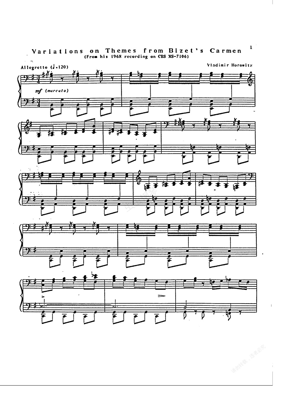 钢琴谱:卡门主题变奏曲 Carmen Variations - 根据比才歌剧《卡门》主题改编(horowitz bizet carmen 1968年skinner版)