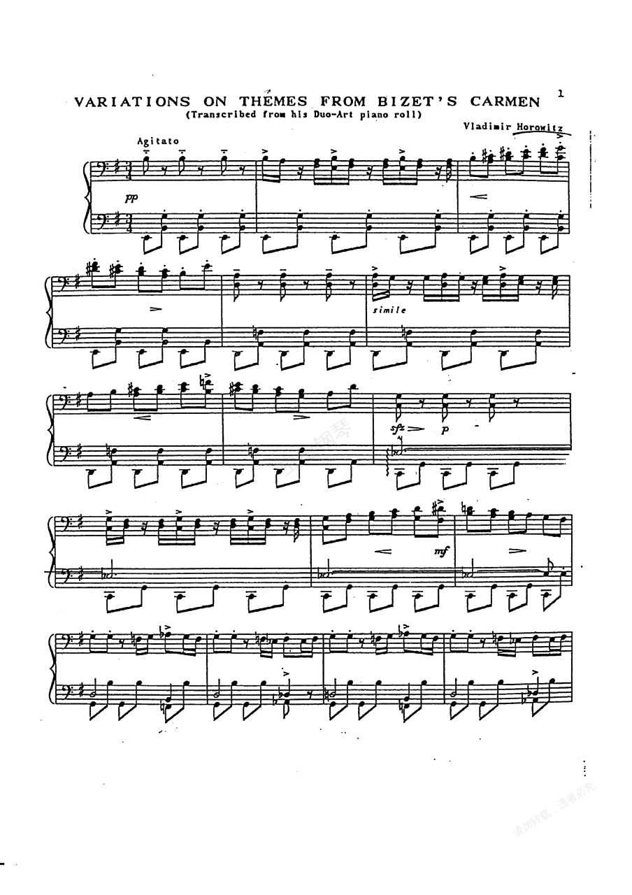 钢琴谱:卡门主题变奏曲 Carmen Variations - 根据比才歌剧《卡门》主题改编(Bizet-Horowitz (1928) Carmen Fantasy (Pellisorius))