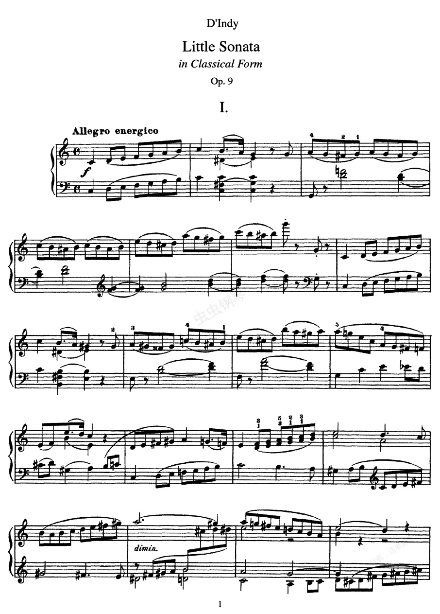 古典小奏鸣曲 Dans La Forme Op.9《古典小奏鸣曲》 Dans La Forme Op.9 ,全称是“以古典风格而作的钢琴小奏鸣曲”,作于1880年,于1888年出版(另一说法是1900年)。全曲共四个乐章:第一乐章,有力的快板,C大调,4/4拍。第二乐章“行板” ,有表情的行板,f小调,2/4拍。第三乐章“谐谑曲” ,不过分的小快板,a小调,3/4拍。第四乐章“终曲” ,不过分的甚快板,C大调,2/2拍。