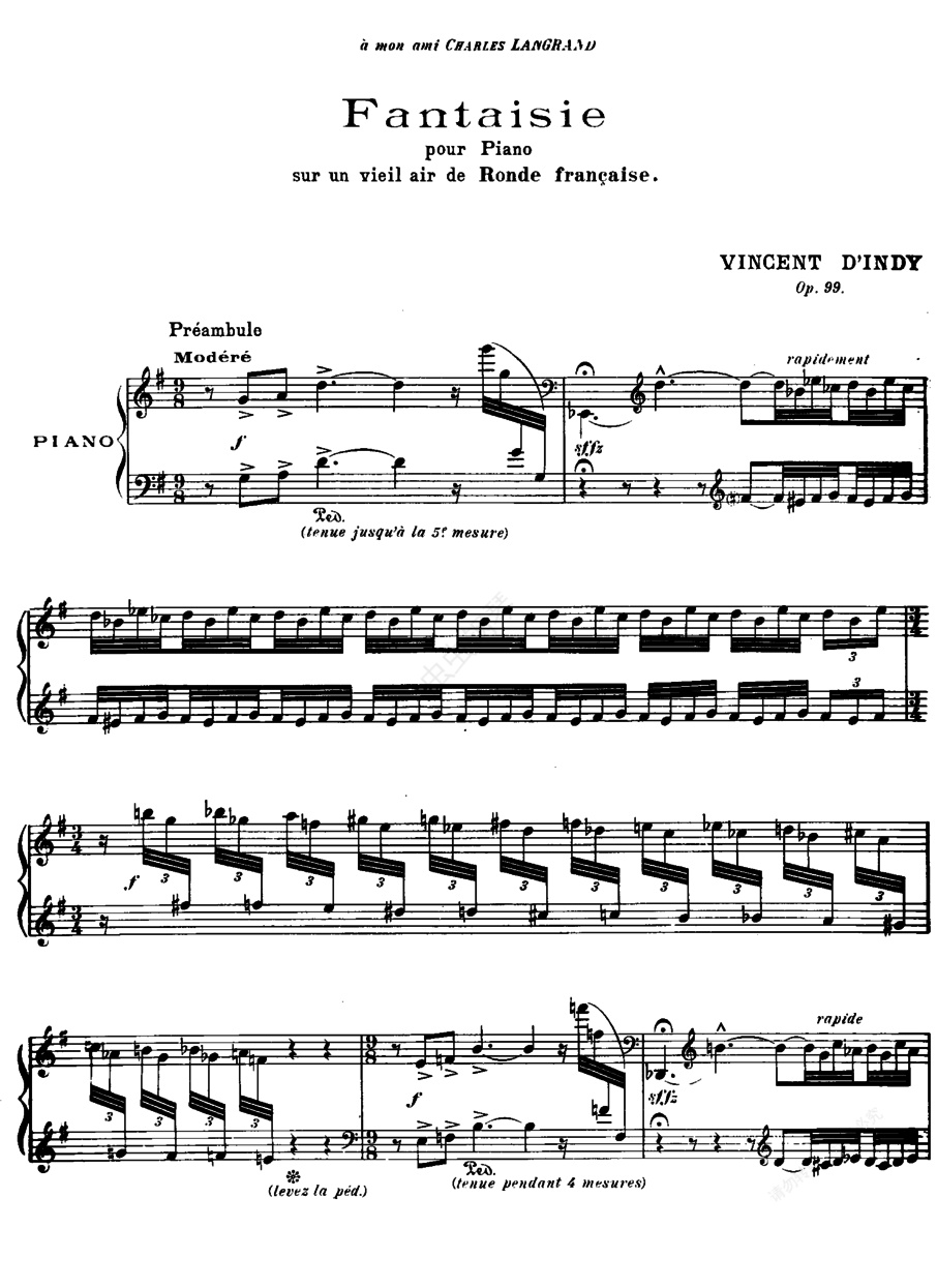 古老的法国童谣幻想曲 sur un Vieil Air de Ronde Op.99《古老的法国童谣幻想曲》 sur un Vieil Air de Ronde Fran&;aise Op.99 ,作于1930年,题献给他的朋友查尔斯•朗格兰(),尽管那时朗格兰已经成为一名铁路工人。作品由让• 杜瓦扬(Jean Doyen)于1931年3月28日在国际音乐协会演奏厅(Société)首演,乐谱于1932年出版。这是一首自由变奏曲式幻想曲,采用G大调,由前奏、主题、五个变奏、间奏、赋格变奏和终曲组成。其主题采用的是一首著名的法国传统童谣“骑士” 。1. 前奏 ,G大调,9/8拍,中板。2. 主题 Theme ,G大调,6/8拍,进行曲速度。3. 变奏一 Var.I ,b小调,6/8拍,慢一倍的速度。4. 变奏二 ,B大调,3/8拍,快板。5. 变奏三 ,G大调,3/4拍,速度同第一变奏。6. 变奏四 ,降E大调,4/4拍,进行曲速度。7. 变奏五 Var.V ,C大调,4/4拍,甚快的中板。8. 间奏曲 ,G大调,9/8拍,中板。9. 变奏六 ,G大调,3/4拍,赋格。10. 终曲 ,G大调,12/8拍,非常生动的。