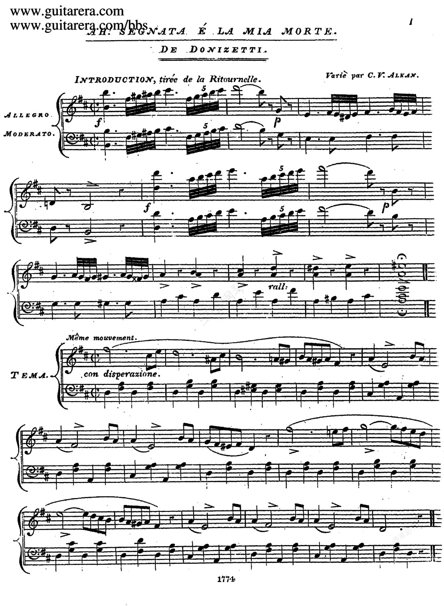 D大调钢琴变奏曲 - 阿尔坎根据歌剧《安娜·波萊娜》主题而作多尼采蒂第一部在国际上取得成就的歌剧是《安娜·波萊娜》Anna ,作于1830年,首次在米兰上演,后6个月在巴黎上演,然后在伦敦国王剧院上演。在创作这部庄严的歌剧之前,多尼采蒂已经写作过三十多部歌剧,但都不及这部《安娜·波萊娜》Anna 来得予人印象深刻。这部以十六世纪英国皇室为背景的歌剧,其中最著名的场景就是第二幕终曲的“疯狂场景”:被英王亨利八世设计、结果沦为阶下囚的皇后安娜·波萊娜在精神恍惚中,回忆起少女时代在家乡古堡与青梅竹马共度的欢乐时光。最后则在失神状态下,魂归离恨天!阿尔坎将《安娜·波萊娜》中的“啊!我的命运将被掌控” Ah! e la mia sorte 作为主题创作一首《D大调钢琴变奏曲》 on "Ah! e La Mia Sorte" in D Major 。
