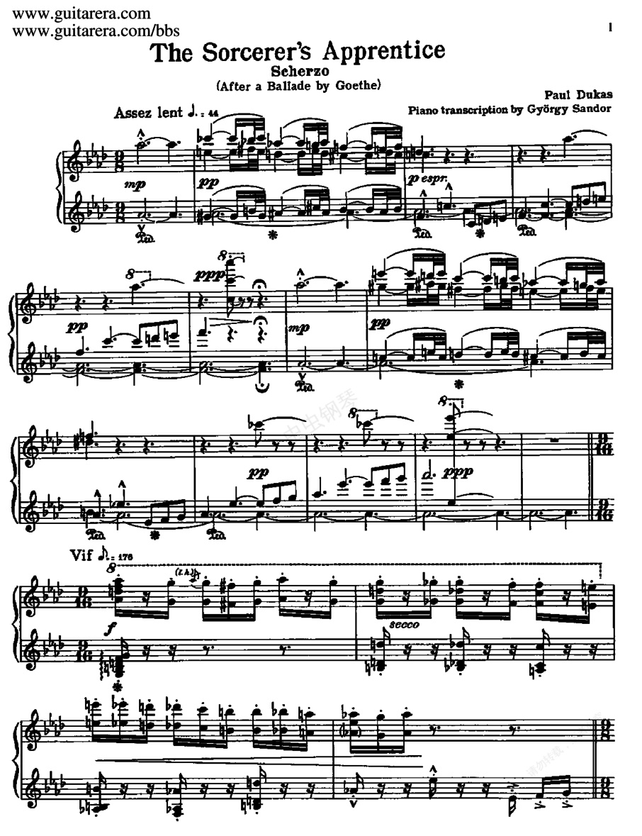 交响诗《魔法师的弟子》’s - 钢琴独奏版杜卡斯早斯创作受瓦格纳影响,1897年以交响诗《魔法师的弟子》(又译“小巫师”)一举成名。交响诗《魔法师的弟子》’s ,谐谑曲体裁,作于1897年。《魔法师的弟子》是古埃及故事,哥德把它变为叙事诗,叙述有一个魔法师的弟子学到一句咒语,能使扫帚获得生命,并可令其取水。魔法师的弟子因此让扫帚取水,因未学到停止取水的咒语,扫帚取水不止,眼看屋里泛滥成灾,这时魔法师赶来,口念解语,才解救了这一场无妄之灾。哥德的作品充满了欢乐的幽默。杜卡斯在这部作品的手稿上标明有三个主题。第一个是引子开头带神秘色彩的几节,小提琴中有耍把戏的花招。木管代表徒弟,它的上行短句代表魔法咒语,大管代表扫帚,三支大管表达扫帚去打水时的形态。而第三个主题是号声齐鸣,这是召唤魔法。这部作品1897年5月18日在巴黎首演,它表达的是一种生气勃勃的幽默。用幽默的风格,奇特的节奏和瑰丽多采的配器手法,叙述了歌特的叙事讽刺诗。用大管,双簧管交替断续的奏出“念咒语”主题。急促、紧张,铜管奏出不协和音,情节扣人心弦。