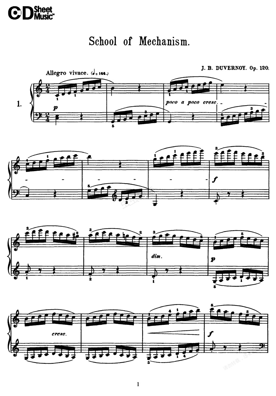 手指技巧练习 of Op.120《手指技巧练习》La Del Op.120 ,又称“十五首钢琴练习曲”15 para Piano ,杜维诺依的这本练习曲教材篇幅适中,技术课题明确集中,相当于车尔尼练习曲 Op.849 的程度,其特点是每一首都有右手和左手的训练任务,而且课题多样,有音阶、琶音、半音阶、短琶音、侧击等等技术课题。它既可作为穿插在车尔尼 Op.849 练习曲后阶段与车尔尼 Op.299 练习曲开始时的辅助练习曲教材,也可以作为衔接这两本练习曲的一本单独练习的教材。目前学生的启蒙学琴年龄越来越小,许多学生在小学一、二年级,甚至幼儿园大班时已经学完了车尔尼 Op.849 练习曲,然而由于年龄的原因,大多数学生手不够大,指尖不够坚实,手的条件尚不宜进入车尔尼快速练习曲的学习。对于这样的学生,杜维诺依是最合适的练习曲教材。1. C大调,2/4拍,活泼的快板,音阶练习曲。2. C大调,2/4拍,快板,五度扩张练习曲。3. C大调,3/4拍,快板,五度扩张练习曲。4. C大调,4/4拍,快板,八度扩张练习曲。5. C大调,4/4拍,中庸的快板,六度扩张练习曲。6. G大调,4/4拍,快板,震音练习曲。7. C大调,4/4拍,中板,十度以上扩张练习曲。8. C大调,3/4拍,中庸的快板,琶音练习曲。9. C大调,4/4拍,中庸的快板,音阶练习曲。10. C大调,3/4拍,快板,半音阶练习曲。11. C大调,4/4拍,中庸的快板,综合手指灵活练习曲。12. C大调,4/4拍,快板,综合手指灵活练习曲。13. C大调,3/4拍,快板,综合手指灵活练习曲。14. F大调,4/4拍,快板,八度练习曲。15. C大调,4/4拍,有表情的中板,震音练习曲。