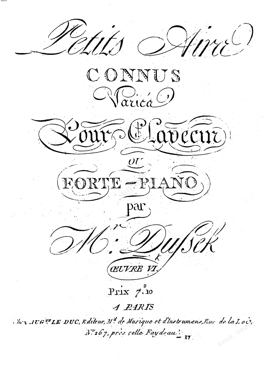 主题与变奏曲集 Airs with Op.6《主题与变奏曲集》 Airs Connûs Variés Op.6,作于1788年,由六首变奏曲组成:1. 稚嫩的爱情 L'amour est,降E大调,2/4拍,中庸的小行板,四个变奏。2. 尼娜的浪漫曲 de Nina,F大调,6/8拍,如歌的小广板,四个变奏。3. 希曼的歌 l'Hymen,A大调,6/8拍,四个变奏。4. 丽萨的歌 Lise,d小调,2/4拍,小行板,三个变奏。5. 柔情的风笛 O ma,g小调,6/8拍,小广板,六个变奏。6. 诺德的歌 du Nord,g小调,2/4拍 ,中庸的快板,五个变奏。