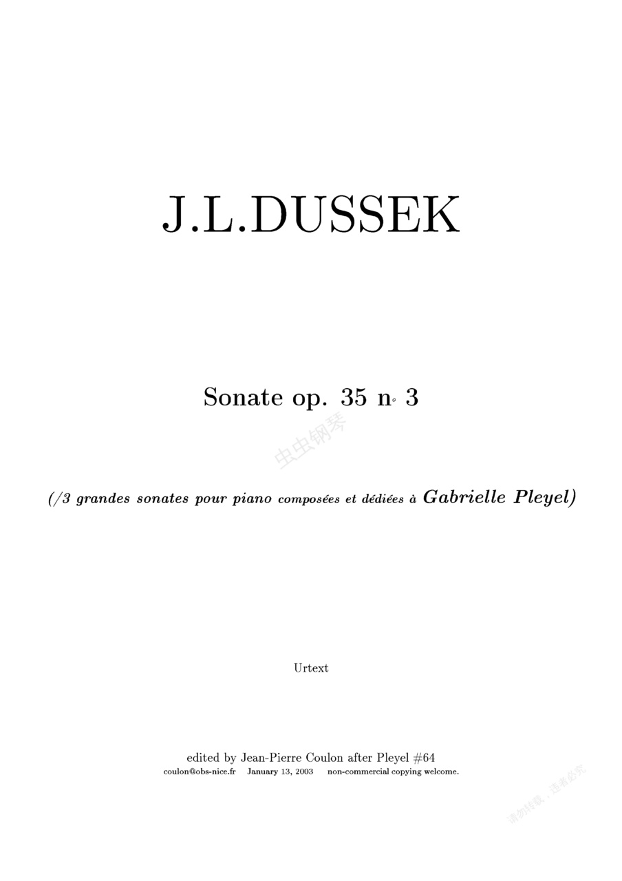 c小调第十三钢琴奏鸣曲 Piano No.13 in c Minor Op.35-3杜舍克一生中创作了大量钢琴作品,其中包括了三十四首钢琴奏鸣曲。这些钢琴奏鸣曲为贝多芬钢琴奏鸣曲的创作带来极大的影响,为其提供了不少灵感来源,不仅在旋律、结构和曲式上有相似之处、甚至有些段落几乎是直接引用了杜舍克的奏鸣曲,例如贝多芬Op.10-1 的开头直接引用了杜舍克Op.39-3 、贝多芬Op.10-3 与杜舍克Op.31-2 及Op.35-2 、贝多芬Op.81a 与杜舍克Op.44(副标题均为“告别”)等。由此可见杜舍克钢琴奏鸣曲在钢琴艺术史中的重要地位。《c小调第十三钢琴奏鸣曲》Piano No.13 in c Minor Op.35 No.3 ,作于1797年。共有四个乐章组成。第一乐章,非常连贯的快板,c小调,4/4拍。第二乐章,有表情的哀婉动人的柔板,降E大调,4/4拍。第三乐章,间奏曲,急板,c小调,4/4拍。第四乐章,终曲,甚快板,C大调,2/2拍
