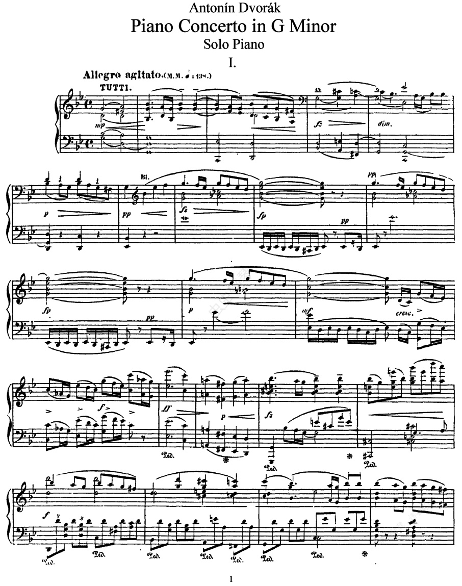 g小调钢琴协奏曲 Piano in g Minor Op.33德沃夏克的《g小调钢琴协奏曲》Piano in g Minor Op.33 ,于1876年9月14日完成,是他比较早期的作品,此作与他所创作的另一部二重奏作品双双获得当时的奥地利国家音乐大奖。虽然这部钢琴协奏曲的艺术含金量并不低,但长期以来始终未能在佳作如林的钢琴协奏曲中得到应有的评价,其原因要追朔到这部作品的创作和首演背景。这部题献给当时捷克著名钢琴演奏家卡罗·斯拉夫科夫斯基(Karel, 1846-1919)的作品于1878年3月24日由斯拉夫科夫斯基在布拉格佐芬音乐厅( Zofin Hall)首演。但那个年代的钢琴在演奏上并没有现在的钢琴那般灵活,而且音色穿透力也欠佳,因此这部作品的首演并没有取得象他日后的《小提琴协奏曲》和《大提琴协奏曲》的良好反响,也因此影响了其流传。直至1919年,捷克著名音乐教育家瓦勒姆·库尔茨(Vilem Kurz, 1872-1945)对德沃夏克这部作品的钢琴演奏部分进行分析,在尽量尊重原作曲家意愿的前提下,对其中的某些段落进行了修改,使之演奏起来能更充分地表现出钢琴的华丽性和光辉性。经修改后的钢琴谱和德沃夏克的原作一并于1956年出版。从此,这部钢琴协奏曲才又重新被众人所认识、接受,并逐步被更多的钢琴演奏家搬上舞台。现今演奏的大多为经库尔茨修改后的乐谱。全曲共分为三个乐章。第一乐章,g小调,4/4拍,激动的快板。在不长的引子过后,由乐队首先奏出第一主题,然后钢琴进入。钢琴与乐队一同交辉生映,绘制出一幅壮丽的图画。这个乐章强悍有力,刚猛而倔强,明显受到贝多芬的影响。其实在德沃夏克创作的作品中,从早年的合唱作品《圣母悼歌》,到后期的《第九交响曲》和《大提琴协奏曲》,始终都有种英雄气概和悲剧色彩。而这部《钢琴协奏曲》正是他早年的一个代表作,那种一往无前的气势和发自内心的豪迈已经表露无余。第二乐章,D大调,4/4拍,持续的行板。激动过后,第二乐章舒缓地展开。在乐队迷人的歌唱性旋律的上面,钢琴演奏着犹如波光粼粼的水面般的伴奏。整个乐章充满了幻想色彩,就像青春少年做的白日梦。使人想起贝多芬《第三钢琴协奏曲》或肖邦《第二钢琴协奏曲》的慢板乐章。第三乐章,g小调,2/4拍,火热的快板。情绪越来越激昂,气氛越来越热烈。到最后乐队就像沸腾的岩浆一般滚滚向前,而钢琴的音流则化作了一簇簇焰火喷射而出,全曲在钢琴和乐队强劲的全奏中辉煌的结束。