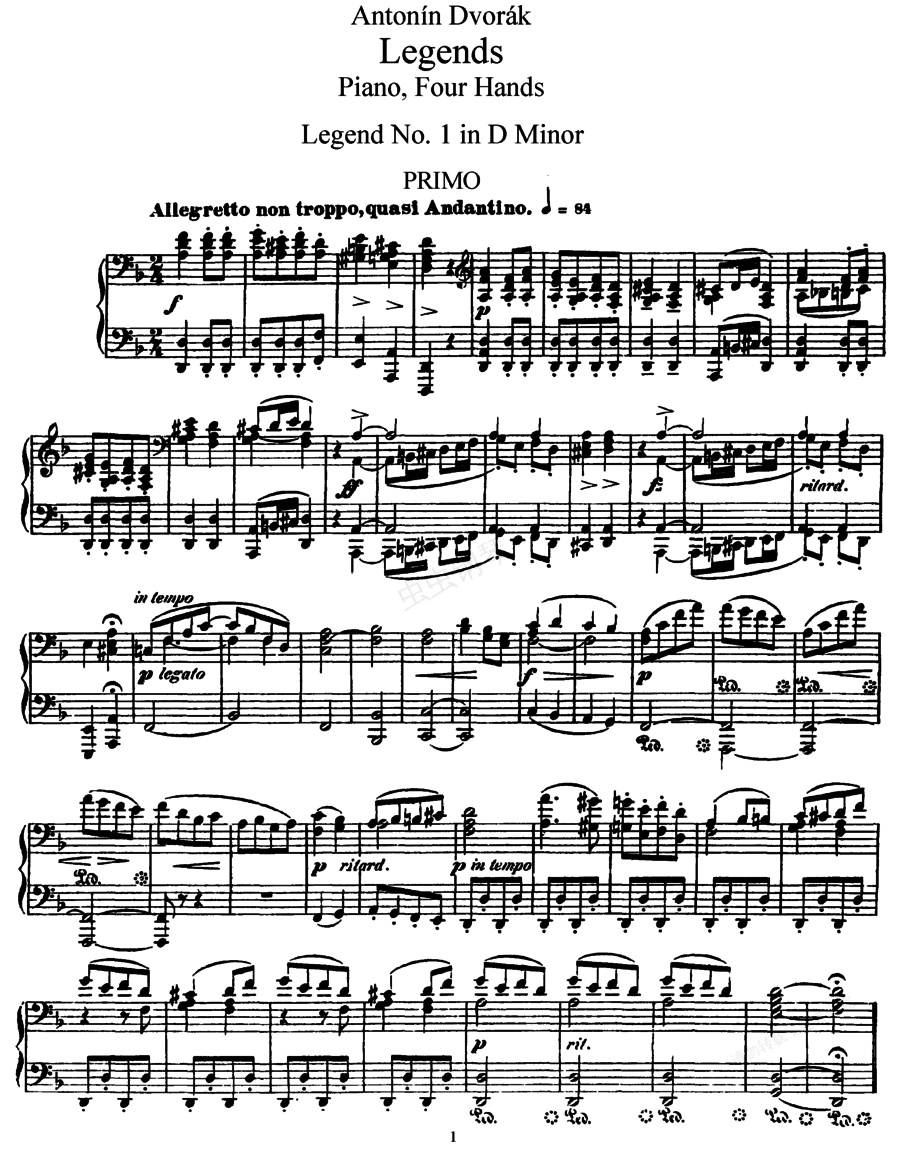 10首传奇 Ten Op.59 - 四手联弹就像两部《斯拉夫舞曲》一样,德沃夏克的这部《传奇》 Op.59 最初也是为钢琴而作的钢琴四手联弹,共十首。但和《斯拉夫舞曲》不同的是,《传奇》所含的舞曲节奏较少,但是旋律更为抒情和带有歌唱性,和声更为隐晦,结构更为复杂。1881年,德沃夏克完成《第六交响曲》,做为消遣,他写下了这十首《传奇》,并在当年秋天就将其改编成管弦乐队作品。尽管这部作品没有《斯拉夫舞曲》有名,但勃拉姆斯仍给予它很高的评价,他写信告诉他们的出版商:“请给予德沃夏克我的祝福,告诉他,他的《传奇》令我感到非常的愉悦。它们非常的迷人,同时他的构思、活力以及创意令人羡慕。”这十首《传奇》分别是:1. d小调 2. G大调 3. g小调 4. C大调5. 降A大调 6. 升c小调 7. A大调 8. F大调9. D大调 10. 降b小调