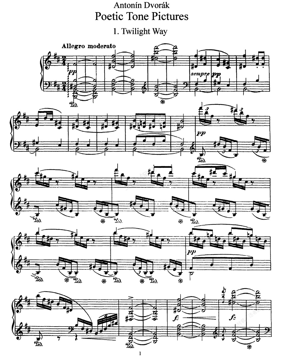 诗意音画 Tone Op.85《诗意音画》 Tone Op.85 ,作于1889年,共包括十三首小品。在十九世纪八十年代,德沃夏克作为一名捷克作曲家,开始不断获得国际性的声誉和奖项,他多次访问英国,并在那里创作、指挥,还在布拉格、莫斯科、圣彼得堡等地举办巡回音乐会。也许是一连串的荣誉激发了他的创作热情,也许是在游历各国之时,他更加眷恋自己祖国的美好河山的景色和风俗人情,更也许是在他之前的舒曼那种将诗意与文学意味融入钢琴音乐创作而写就标题性钢琴组曲的作法,给了他启迪,于1889年,他写出了这套钢琴组曲,向世人展示了他描绘“音乐风景”的高超技艺。这十三首乐曲各有着一个使人浮想联翩的美丽标题,标题内涵充分展现于五彩斑斓的音乐语言中,是一部典型的用音乐语言来描绘文字主题、抒情唯美的钢琴作品集。它包含了相当的技术难度,要完成整部作品的演奏,需有较大的演奏气魄和驾驭能力。当然,也可以抽取某些曲子来单独演奏。1. 黄昏小路 Way ,D大调,2/4拍,中庸的快板。2. 嬉戏 ,G大调,2/4拍,轻盈的快板。3. 古堡 In the Old ,降E大调,4/8拍,慢板。4. 春之歌 Song ,A大调,3/8拍,稍快的快板。5. 农夫之歌 ,降b小调,3/4拍,适当的快板。6. 梦幻曲 ,B大调,2/4拍,行板。7. 富里安特舞曲 ,降a小调,3/4拍,粗暴的快板。8. 精灵之舞' Dance ,降A大调,2/4拍,小快板。9. 小夜曲 ,C大调,4/4拍,如歌而甚快的中板。10. 酒宴 ,c小调,3/4拍,最快板。11. 闲聊 ,F大调,2/4拍,甚快的行板。12. 英雄的坟墓 At a Hero's Grave ,a小调,4/4拍,进行曲式的庄板。13. 圣山上 On the Holy ,f小调,5/4拍,稍慢板。综观整部作品,有以下特点:1. 是规模较为宏大的钢琴组曲作品,其中一些曲子如《黄昏小路》、《嬉戏》、《酒宴》、《英雄的坟墓》等篇幅较长。《英雄的坟墓》不仅篇幅长大,而且是整套作品中音响结构最为宏博宽广的一首,堪称是整套组曲的高潮部分。德沃夏克为了表达如潮涌现的乐思,往往对传统的曲式结构进行大胆的突破,如《嬉戏》、《富里安特舞曲》、《酒宴》都采用了两个中部的“复四部”结构,而《古堡》则将回旋曲式与变奏手法相结合。2. 德沃夏克是善于写作旋律的大师,他的旋律变化无穷而自然流畅,往往有如神来之笔,充满自然的新鲜感,并极其贴合他所要达到的音画效果。在他那富于个性色彩的、浑厚而纯美的旋律中,我们可以体味到浓浓的东欧斯拉夫民族的音乐色彩,而有些曲子中的旋律简直就是一首地道的家乡民歌,如《古堡》、《梦幻曲》、《小夜曲》等。3. 音响色彩华丽,这是德沃夏克作品的一个显著特点。在这部组曲中,《黄昏小路》、《农夫之歌》、《富里安特舞曲》、《嬉戏》等有尤为充分的表现。作曲家用来营造其华丽音乐色彩的手法是多样的:大量出现的八度双音和八度和弦、频繁的转调和离调所产生的大量变化音与变化和弦、在主调和声写作中渗进复调对位手法、连音与跳音的交错使用等。有时,和声与织体的巧妙变化,避免了相同乐句多次重复可能造成的单调,如《嬉戏》;有时,利用和弦音的分解组合使节奏重音发生变化,形成二拍子与三拍子交替出现的生动效果,如《富里安特舞曲》;有时,敏锐地利用调性的某种色彩感来造成符合乐曲意境的色调变化,如《古堡》用的是营造出神秘幽深气氛的降E大调,而《春之歌》则采用明亮而温暖的A大调。