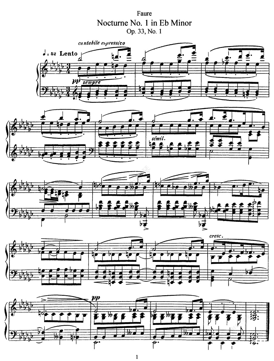 13首夜曲 13福雷共作有十三首《夜曲》 ,跨越了1883-1922年,囊括了其早期、中期及晚期的风格。其风格呈现两极化:迷人(早期)、热情(中期)及艰涩(晚期)。一般人可以立即从他前期作品中感受到他的迷人风采,但很容易就忽略了在其表面下蘊含的深厚情感与压抑,这其实和他的后期作品表面上的严肃是如出一辙的。法国钢琴家玛格丽特·隆形容福雷的钢琴音乐:“福雷或许是我们最伟大的音乐诗人,如果他的钢琴音乐从心灵及灵魂深处传达,用最敏锐的讯息感动我们,使我们陶醉,那我们必须承认,弹奏福雷的音乐是非常困难的,这需要具备完美无缺的技巧,独立且恰如其分的指力,及全盘熟悉钢琴的各种音色。当然,他的音乐绝不是为了炫技而作。”这也充分体现在他的这十三首夜曲中。这十三首夜曲分别是:1. 降e小调夜曲 Op.33-1,作于1883年,慢板,主旋律多少带有一些忧郁,伴奏始终使用和弦。憧憬般的新旋律乘着似波浪起伏的低音部伴奏出现,转调而形成激情的插句。高音部分低音部以对话方式表达后,达到高潮,经过音阶乐句的终止式回归于忧郁的主旋律,最后是类似摇篮曲的气氛。2. B大调夜曲 Op.33-2,作于1883年,极富表情的小行板。主旋律是有明显特征的节奏支配的高音部忧伤的旋律与内声部和低音部组成的伴奏,接着b小调,不要太快,十六分音符,似焦虑的六连音音型的伴奏被反复进行。在进行中高音部出现新旋律,不断改变处理手法后,回归于主部。尾声是中庸的快板。3. 降A大调夜曲 Op.33-3,作于1883年,流畅的行板。在含切分音特征的低音节奏下,开始混合有三连音符的优雅旋律。随后在三连分散和弦之间出现第二主题,两个主题形成优雅的对比。它们的纠缠、发展至高潮后,第一主题像梦幻般再度回来,接近曲终时,微现第二主题,摇摆不定的三连分散音符像烟雾一样袅袅上升,最后慢慢消散。柯尔托对此曲评说:“这首夜曲的新颖之处是它的每一个音符犹如撩人心弦的绵绵情话一般,是花前月下两情遣眷般的情绪,它是温暖而部优官能性的旋律的统一性,以及和声与平衡的节奏所带来的清静的愉悦。”4. 降E大调夜曲 Op.36,作于1885年,极中庸的行板。日本人松本太郎对此曲的评说:“低音自始至终像黄昏前的钟声一样响着,右手继续弹奏甜美而充满青春气息和无限希望的旋律与和声,间奏部虽也有感情的亢奋,但并不激烈。然后宁静而缓慢地进入尾奏,幽幽、静静地逐渐消失。”柯尔托在其中看到了悔恨与热情,“因爱被拒绝而失去的欢乐”。5. 降B大调夜曲 Op.37,作于1885年,如同小快板的行板。以富于表情的旋律开始,旋律渐渐地增加阴郁的气氛,最后进入新旋律形成的小结尾而渐渐兴奋。中间部进入快板,情绪带悲怆,感情增加激动,有意图的新主题率十六分音符三连音的伴奏展开,然后主部在现,宛如小快板的行板部分重复,以短小尾奏结束。6. 降D大调夜曲 Op.63,作于1894年,慢板。柯尔托说此曲是引导我们从音乐的微妙喜悦,走向人类情感最高表现的一条最高贵的捷径。首先开始是由三连音构成的柔美旋律,以八度音程重复后,极中庸的稍快板,升c小调;曲趣转而成为柔和而又带谐谑曲味的律动部分,再转中庸的快板。轻快活泼的十六分音型,出现充满憧憬的优美旋律,再以滑奏效果一样的快速音群转为中板。然后以低音八度音程回忆开头主题,回到开头形式,以八度音程走向终结。7. 升c小调夜曲 Op.74,作于1899年,极慢板。先出现富于冥想性的旋律,接着,稍快的新旋律冒出,两个旋律对比而反复。接着B大调,快板,开头是圆房传来钟鸣似的高音部升C八度,然后出现令人感动的二重唱。趋向高潮后回归极慢板的主部,被省略的两个主题再现后进入稍快的尾奏。8. 降D大调夜曲 Op.84,作于1902年,不太慢的慢板。不是三段体,结构相应更为简单,乘着十六分音符的音阶乐句的伴奏,歌谣般的优美曲调转变出各种各样的调性。9. b小调夜曲 Op.97,作于1908年,呈献给柯尔托。柯尔托对此曲的平价是:“可以清楚地听出吐露本身秘密的强烈意念,沉思的性格把思维和表达完全调和了。”他认为,此曲像“无法隐藏对爱情的饥渴一般”。10. e小调夜曲 Op.99,作于1909年,颇似慢板的速度,在较旋律缓慢的节奏伴奏型上,成仙具沉稳内省情绪的曲调,悲壮气氛慢慢增加而高扬。高潮有扬眉吐气之感,然后恢复原速度,结尾又多少有些忧郁。11. 升f小调夜曲 Op.104,作于1913年,为悼念早夭的音乐家毕罗·拉罗夫人。此曲有中间部,开头有如葬礼进行曲,更恍惚是哀悼的钟声,有悲恸的旋律,柯尔托评价道:“刺痛人心,值得赞叹的悲歌。有情绪经过压抑的纯粹,有太古墓碑般的朴素与威严,还有腼腆的谦恭,没有一首曲子比它更能触动人心,牵动人的悲叹之情。”12. e小调夜曲 Op.107,作于1916年,中庸的快板。选用两个长大的旋律,两者的反复构成悲歌,开始旋律是在内声部的三连音伴奏音型上走出,因此表现出无法压抑的骚动。第二旋律在十六分音符伴奏音型上走出,略呈兴奋状,两旋律再现时,苦恼开始弥漫开来,但又很快被生气勃勃的表情所替代。13. b小调夜曲 Op.119,作于1922年,行板,主部似已有死亡预感,呈现庄严的圣咏风格。与其说是悲痛,不如实说对上苍的感激之情。中段速度加快,用三连音音型伴奏支持新旋律,然后再度回到庄严的主部,以宁静而告终。