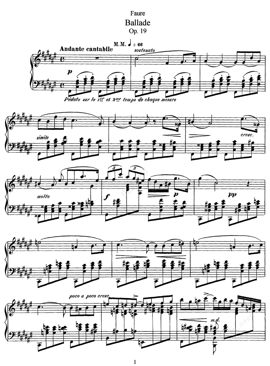 叙事曲 Op.19 - 为钢琴与乐队而作福雷最伟大的作品之一《叙事曲》 for Piano and Op.19 ,为钢琴和乐队而作,作于1881年。这是福雷的早期作品,据说是听完瓦格纳的《齐格弗里德》中《森林的细语》而创作。它借用琶音和经过段的表现,构成了福雷风格的支柱。虽然这部作品起初是作为独奏曲目来创作的(李斯特曾经凭空推断道:这部作品将无法演奏),但是后来不但被人经常演奏,而且还有了钢琴与乐队的协奏版本。整个作品充满了和谐的音乐语言,分外清新和舒缓,听后大有舒筋活络、释然放松地感觉。正是这种和谐的音乐语言形成了福莱音乐的特点,对此无需细究。在福雷的一生中,他曾经不懈地沿着他早先发现的道路去发掘某些地区和谐的民风与民乐。一个真正的作曲家善于在听众之中创造某种期盼,然后又从听众的反馈当中进行演变和提炼。通过某种音乐色彩的变更、声音的诱导或者想象,福雷总是诠释出一些出乎意料的东西。反复倾听他的作品似乎不会减少这些出乎意料的快乐效果。福雷的叙事曲依然抓住了音乐结构的神韵。开始很长的乐段将我们引入第一个主题。采用4/4节拍,然后进入第二个主题,同样的4/4节拍,最后是另外的两个主题,以6/8节拍收尾,并在其间加入了一些副题元素。如此稳定而又清透的曲式似乎成为福雷所有钢琴作品的一个写真。然而,重要之处并不在此,而在于曲式的内涵。正如很多行家所允诺的那样,我们在这里感受到了福莱的亲切、微妙、文雅、工于装饰以及梦境。福雷的作品当中并不会缺失挚情的翱翔、急切的高潮、透明的情感。追赶这种优雅的诠释和欢欣的音乐语言,需要充裕的情感动力,一种发自内心的情感动力。这种品质在福雷中期以后的作品中展现得更加淋漓尽致。在我看来。福莱中期以后的作品更加成熟,更加令人慑服。其早期作品中那种单纯的欢乐已经一去不复返了,取而代之的,是更加优美的旋律融合以及和谐的技巧处理。这首乐曲属于福雷初期的作品,此曲原是为钢琴独奏而作的,后来才改写成钢琴与乐队合奏的叙事曲。乐曲的形式独特,从头至尾只用三个主题来不断地加以反复,没有其他的要素。乐曲分三部分,主要在升F大调上。第一部分 如歌的行板,升F小调,4/4拍。清爽的第一主题首先由钢琴奏出,之后以A大调反复主题的前半,然后再回到主调。第二部分 中庸的快板,降e小调。由钢琴首先呈示第二主题。之后是第一主题与第二主题多次轮流出现。第三部分 行板,6/8拍。第三主题先由长笛奏出,其中伴有2小姐钢琴华丽的分解和弦。之后是第三主题与第二主题相互交缠在一起自由地发展下去,最后根据第三主题的乐思构成短小的结尾。