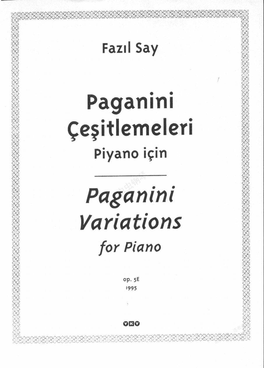 帕格尼尼主题变奏曲 In the Style of Jazz《帕格尼尼主题变奏曲》 In the Style of Jazz ,全名为“现代爵士风格帕格尼尼主题变奏曲”,作于1995年,现代爵士风格。主题即是帕格尼尼最为有名的《a小调第二十四号随想曲》,随后是六个不同风格的变奏所组成。而在塞伊在演奏中又添加了三个附加的变奏,故全曲总计由九个变奏所组成。钢琴家本人常用的演奏顺序是:主题、变奏一、变奏二、变奏三、附加变奏二、附加变奏一、变奏六,其余三个段落常被省略。1. 主题 Theme ,a小调,4/4拍,急板。2. 变奏一 Var.1 ,急板。3. 变奏二 Var.2 ,稍快的,2/2拍。4. 变奏三 Var.3 ,伦巴风格(Rumba),2/2拍。5. 变奏四 Var.4 ,自由的行板。6. 变奏五 Var.5 ,新纪元音乐风格(New Age),转入A大调,中庸的快板。7. 变奏六 Var.6 ,摇摆乐风格(Swing),回到a小调上,急板。8. 附加变奏一 Extra Var.1 ,冷爵士风格(Cool),中板,4/4拍。9. 附加变奏二 Extra Var.2 ,即兴风格行板。10. 附加变奏三 Extra Var.3 ,拉格泰姆风格()。
