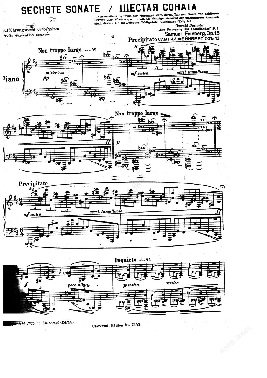 第六钢琴奏鸣曲 Piano No.6 Op.13《第六钢琴奏鸣曲》Piano No.6 Op.13 ,作于1923年。这是前六首钢琴奏鸣曲中最为优秀的一首,单乐章,采用b小调记谱,6/4拍,不过分的广板-急速的-庄板-无拘束的快板。作品是悲剧性的,充满了斯克里亚宾式的神秘色彩。开头的钟声部分让人联想起德彪西的前奏曲《被淹没的教堂》,雅纳切克和勋伯格指出,这里暗藏了巴赫之名“”动机,随后出现的块状和弦似乎是施托克豪森早期电子音乐的先驱。