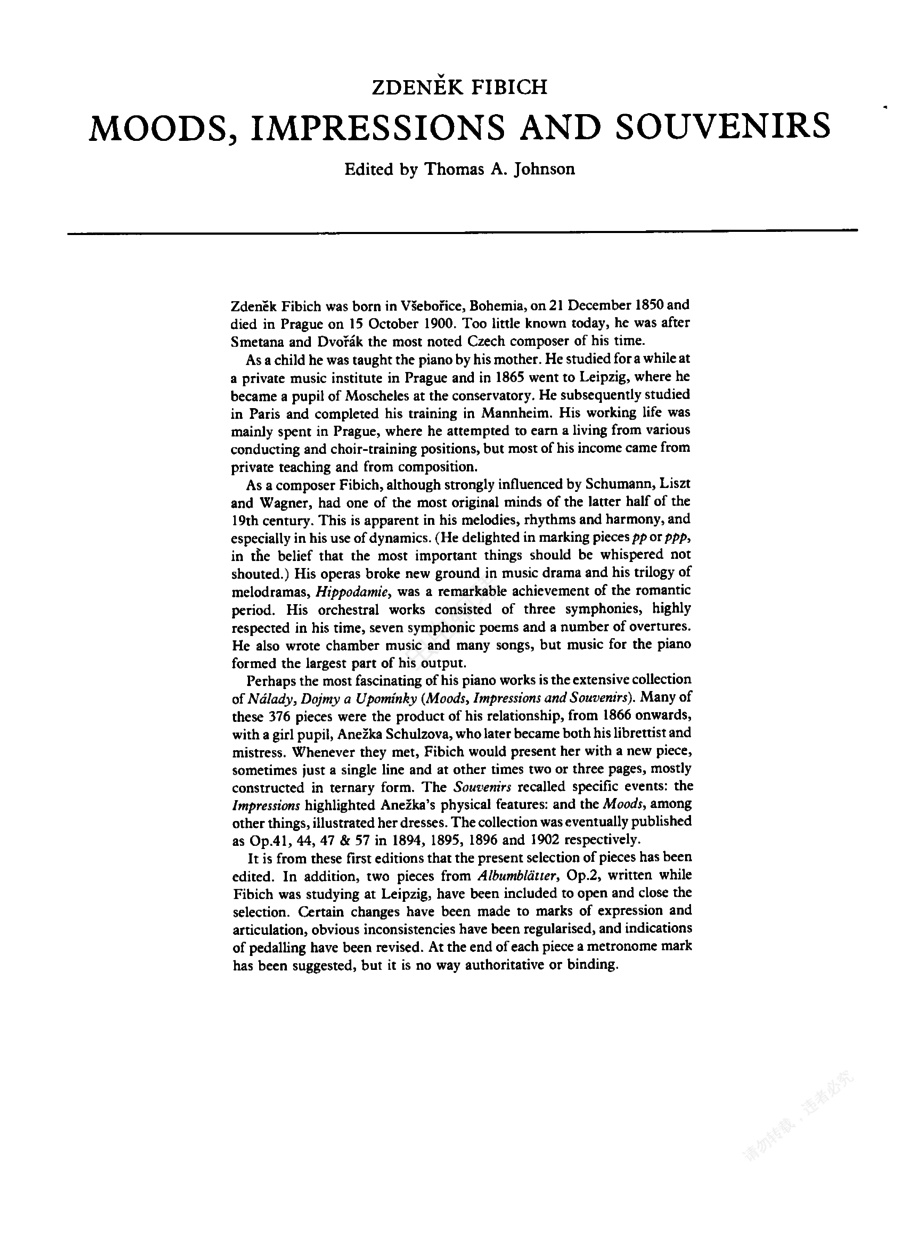 《心情、印象与回忆》选曲集是从这376首小品中选出来二十六首,再加上菲比赫的另一组钢琴小品《纪念册的一页》 d'Album Op.2 中的两首小曲所组成的《心情、印象与回忆》选曲集 from Moods, and 。1. 献辞 ,选自《纪念册的一页》Op.2-1 ,D大调,3/8拍,小行板。2. 活泼的小快板 ,原第9首,选自Op.41 第一册,G大调,4/8拍。3. 谐谑风格行板 ,原第73首,选自Op.41 第二册,降B大调,2/4拍。4. 柔板 ,原第50首,选自Op.41 第二册,降A大调,2/4拍。5. 慢板 Lento ,原第82首,选自Op.41 第二册,G大调,4/4拍。6. 压抑的 ,原第75首,选自Op.41 第二册,g小调,2/4拍。7. 庄严的 ,原第125首,选自Op.41 第三册,降B大调,4/4拍。8. 有节制的 ,原第97首,选自Op.41 第三册,F大调,2/4拍。9. 优雅的小行板 ,原第61首,选自Op.41 第二册,D大调,3/4拍。10. 行板 ,原第11首,选自Op.41 第一册,G大调,4/4拍。11. 稍快的 Con Moto ,原第107首,选自Op.41 第三册,G大调,2/4拍。12. 行板 ,原第211首,选自Op.47 第一册,升F大调,3/4拍。13. 行板 ,原第308首,选自Op.47 第七册,降A大调,3/4拍。14. 稍快的行板 Con Moto ,原第10首,选自Op.41 第一册,G大调,4/8拍。15. 行板 ,原第167首,选自Op.41 第四册,A大调,3/4拍。16. 行板 ,原第248首,选自Op.47 第三册,A大调,3/4拍。17. 极温柔的行板 e Dolce Assai ,原第108首,选自Op.41 第三册,C大调,2/4拍。18. 小行板 ,原第116首,选自Op.41 第三册,降D大调,6/8拍。19. 小行板 ,原第83首,选自Op.41 第二册,G大调,3/8拍。20. 小行板 ,原第161首,选自Op.41 第四册,降B大调,3/4拍。21. 连贯的 ,原第185首,选自Op.44 第三册,A大调,2/4拍。22. 优雅的小行板 ,原第137首,选自Op.41 第四册,E大调,3/4拍。23. 充满感情的 Con ,原第54首,选自Op.41 第二册,降A大调,3/4拍。24. 神秘的庄板 Grave e ,原第90首,选自Op.41 第三册,A大调,4/4拍。25. 稍快的 Con Moto ,原第165首,选自Op.41 第四册,A大调,6/8拍。26. 小行板 ,原第342首,选自Op.47 第十册,G大调,6/8拍。27. 慢板 Lento ,原第139首,选自Op.41 第四册,降D大调,12/8拍。28. 尾声 ,选自《纪念册的一页》Op.2-5 ,G大调,3/4拍,中庸的快板。