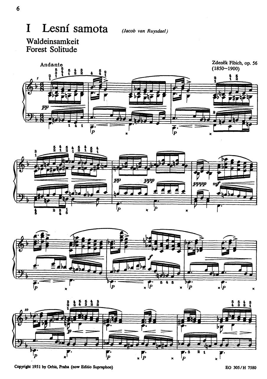 音画练习曲 Op.56《音画练习曲》Malířské Op.56 ,作于1898-1899年,是菲比赫最著名的钢琴作品之一,共由五首小曲组成:1. 孤寂的森林 Lesni ,F大调,6/8拍,行板。2. 忏悔节和四旬斋的冲突 Spor s ,C大调,2/4拍,有力的快板。3. 极乐之舞 Rej ,C大调,6/4拍,稍快的行板。4. 木卫一和木星 Io a ,E大调,3/4拍,中板。5. 花园庆典 ,F大调,6/8拍,优雅的小行板。其中有风笛舞曲、磨坊舞曲和加沃特舞曲。
