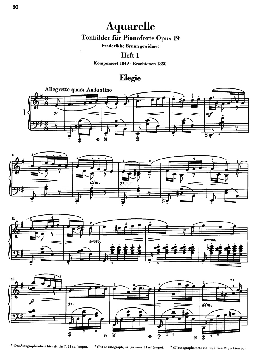 水彩画 Op.19《水彩画》 Op.19 ,钢琴套曲,由十首小品组成,共分成两卷,每卷各五首。其中第一卷(第1-5首)作于1849年,第二卷(第6-10首)作于1852年(另一说法为1850年),乐谱于1852年出版,1. 悲歌 ,e小调,3/8拍,近似小行板的小快板。2. 谐谑曲 ,E大调,6/8拍,优雅的快板。3. 歌谣 ,a小调,2/4拍,有表情的小快板。4. 幽默曲 ,G大调,2/4拍,轻盈的甚快板。5. 船歌 ,F大调,6/8拍,中庸的快板。6. 随想曲 ,降E大调,6/8拍,活泼的甚快板。7. 浪漫曲 ,D大调,4/4拍,稍快的行板。8. 间奏曲 ,B大调,6/8拍,有节制的快板。9. 新事曲 ,降A大调,2/4拍,小快板。10. 谐谑曲 ,A大调,3/8拍,最活泼的快板。