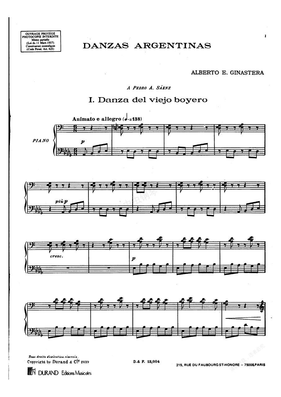 阿根廷舞曲 Op.2《阿根廷舞曲》 Op.2 ,于1937年出版,由三首优美的阿根廷风格舞曲组成,皆为简练却精致的作品,属于吉纳斯特拉第一时期的创作。它们分别是:1. 老牧羊人之舞 Danza del viejo ,6/8拍,生动的小快板,右手用C调记谱,左手用降D调记谱,是生动活泼、强调节奏性的舞曲。2. 可爱的少女之舞 Danza de la moza ,a小调,6/8拍,甜美且有表情的,音乐优美而煽情,带着南美舞曲摇曳生姿的流动感,充满诱惑力。这是吉纳斯特拉最受人喜爱的一首钢琴小品。3. 热情的牧人舞 Danza del ,6/8拍,狂野不羁且有力的,C调记谱,标示着精力充沛的指示以及狂飙的速度带领观众进入一个目眩神驰的世界,是一首相当精采的作品。