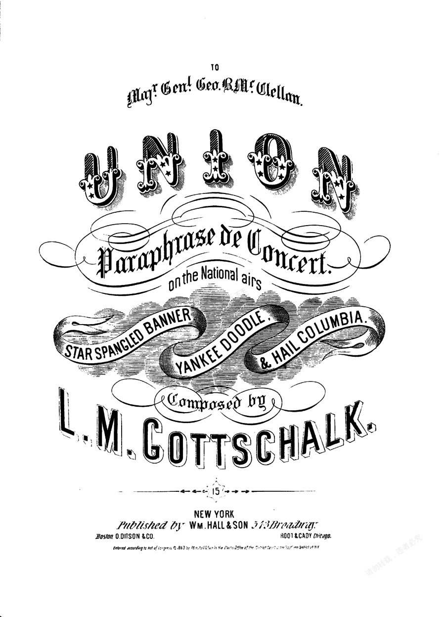 民间曲调音乐会改编曲 Union Op.48《民间曲调音乐会改编曲》Union on Airs Op.48 ,作于1862年。这首作品包括了三首民间曲调:星条旗(Star)、扬基都德()、为哥伦比亚欢呼(Hail)。首先是降e小调,4/4拍的中速的快板引子;接着是升F大调,3/4拍的“星条旗”;短暂地回到引子旋律后,接着出现的是降B大调,4/4拍的“扬基都德”,这里有着模仿小鼓声的低音部带装饰音的八分音符断奏;最后进入的是降E大调的“为哥伦比亚欢呼”曲调,在一片辉煌中结束全曲。