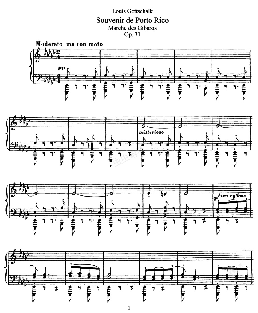 波多黎各的回忆 de Porto Rico Op.31戈特沙尔克在1853-1854年以及1857-1862年多次抵达古巴,在这段时间,他也游历了波多黎各,海蒂等岛国。之前他已经灵活地将西班牙及美国民间和流行音乐素材运用在创作上,同样,拉丁美洲的探戈节奏、热带音乐风格旋律也吸引了他,使他写下了另外的一些作品。《波多黎各的回忆》 de Porto Rico Op.31 就是其中的一首。《波多黎各的回忆》 de Porto Rico Op.31 ,副标题“吉巴罗斯进行曲” des ,作于1857年。降e小调,2/4拍,中板速度,全曲节奏鲜明,具拉美风格。