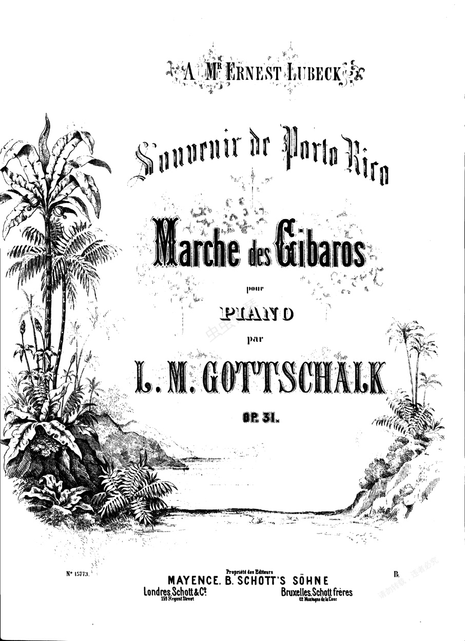 波多黎各的回忆 de Porto Rico Op.31戈特沙尔克在1853-1854年以及1857-1862年多次抵达古巴,在这段时间,他也游历了波多黎各,海蒂等岛国。之前他已经灵活地将西班牙及美国民间和流行音乐素材运用在创作上,同样,拉丁美洲的探戈节奏、热带音乐风格旋律也吸引了他,使他写下了另外的一些作品。《波多黎各的回忆》 de Porto Rico Op.31 就是其中的一首。《波多黎各的回忆》 de Porto Rico Op.31 ,副标题“吉巴罗斯进行曲” des ,作于1857年。降e小调,2/4拍,中板速度,全曲节奏鲜明,具拉美风格。