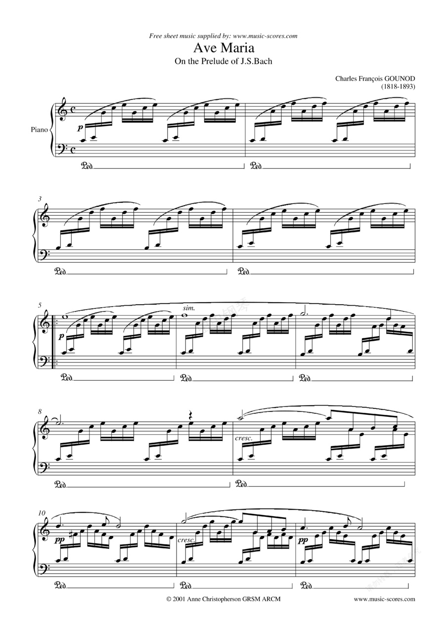 圣母颂 Ave Maria 这首常用于小提琴独奏的《圣母颂》Ave Maria ,原是法国著名作曲家古诺的声乐名曲。一生往返于教堂、修道院与歌剧院的古诺,在宗教音乐与歌剧方面,有着极其伟大的成就。1855年,古诺以巴赫在一百五十年前所作的《C大调前奏曲》(选自巴赫的《平均律钢琴曲集》第一卷)为伴奏,配上了这首世人熟知的歌曲《圣母颂》。这是一首曲意崇高,旋律优美,跟伴奏吻合得天衣无缝的音乐。创作这样充满宗教美感的乐曲,只有像古诺这样的,具有伟大音乐天才与真诚宗教信仰,并且仔细探究过巴赫音乐之灵魂的音乐家方能为之。原作是一首音域宽广的女高音曲,是采用天主教的圣母祈祷文做为歌词的。本曲被认为是音乐家跨年代合作的典范之作。这里是改编成钢琴独奏的《圣母颂》。