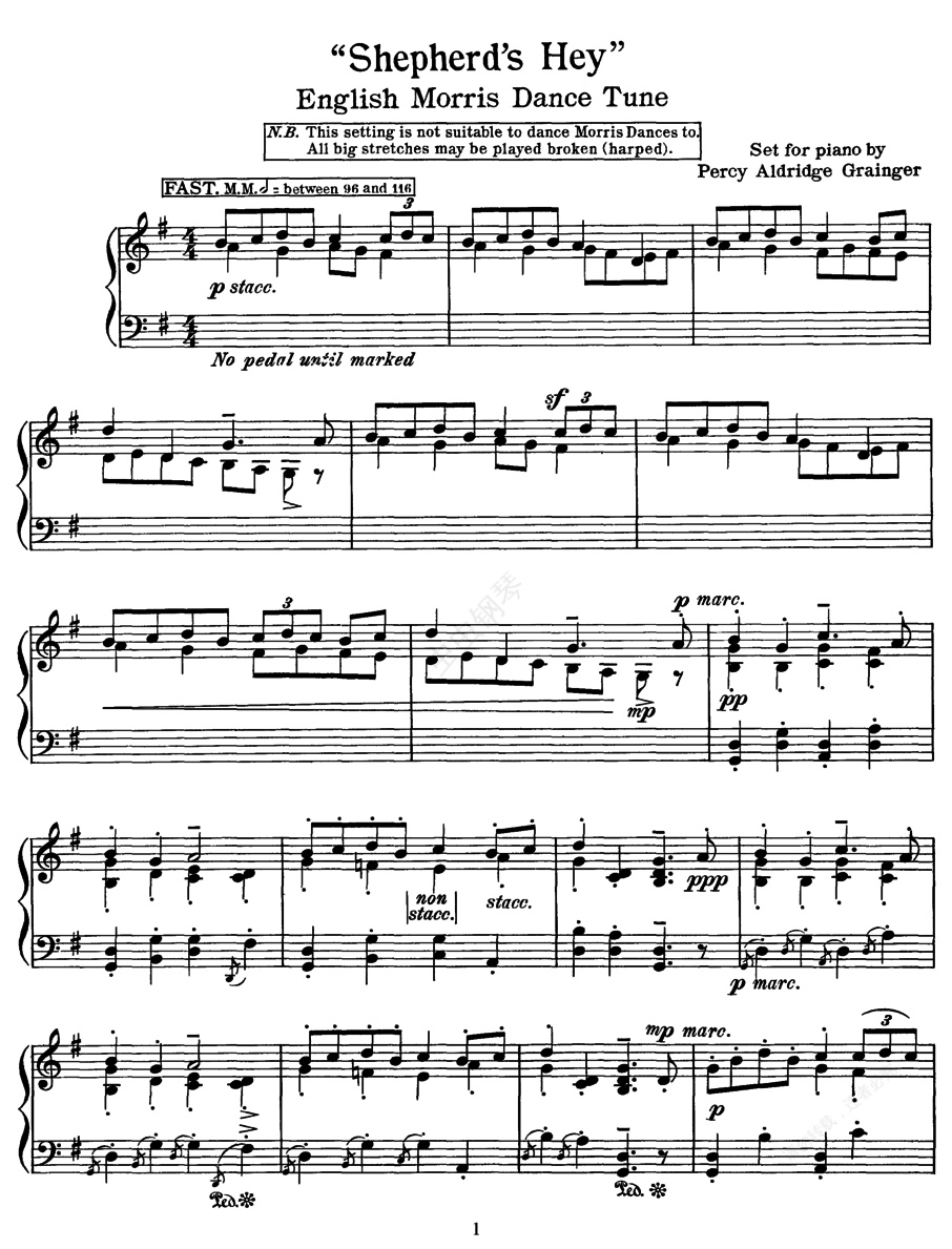 英国莫里斯舞小调“牧羊人的呼唤”’s Hey《牧羊人的呼唤》’s Hey ,副标题为“英国莫里斯舞小调” Dance Tune ,是葛仁杰为纪念他最敬爱的格里格而作的《英国民间曲调集》 中的第四首。这首莫里斯舞小调由塞西尔·夏普(Cecil Sharp)为葛仁杰收集,是英格兰地区最为人熟知的民间小调之一。葛仁杰将其写成“简易小品”和“音乐会演奏曲”两个版本的钢琴作品,收入本曲集中的是音乐会演奏曲版本。G大调,4/4拍,曲子的开头标示“该曲子不适合用于跳莫里斯舞”,“大扩张和弦可用琶音的形式演奏”,并对踏板的使用提出严格遵循作曲家标示的要求。作品中对该曲调进行了四次变奏。