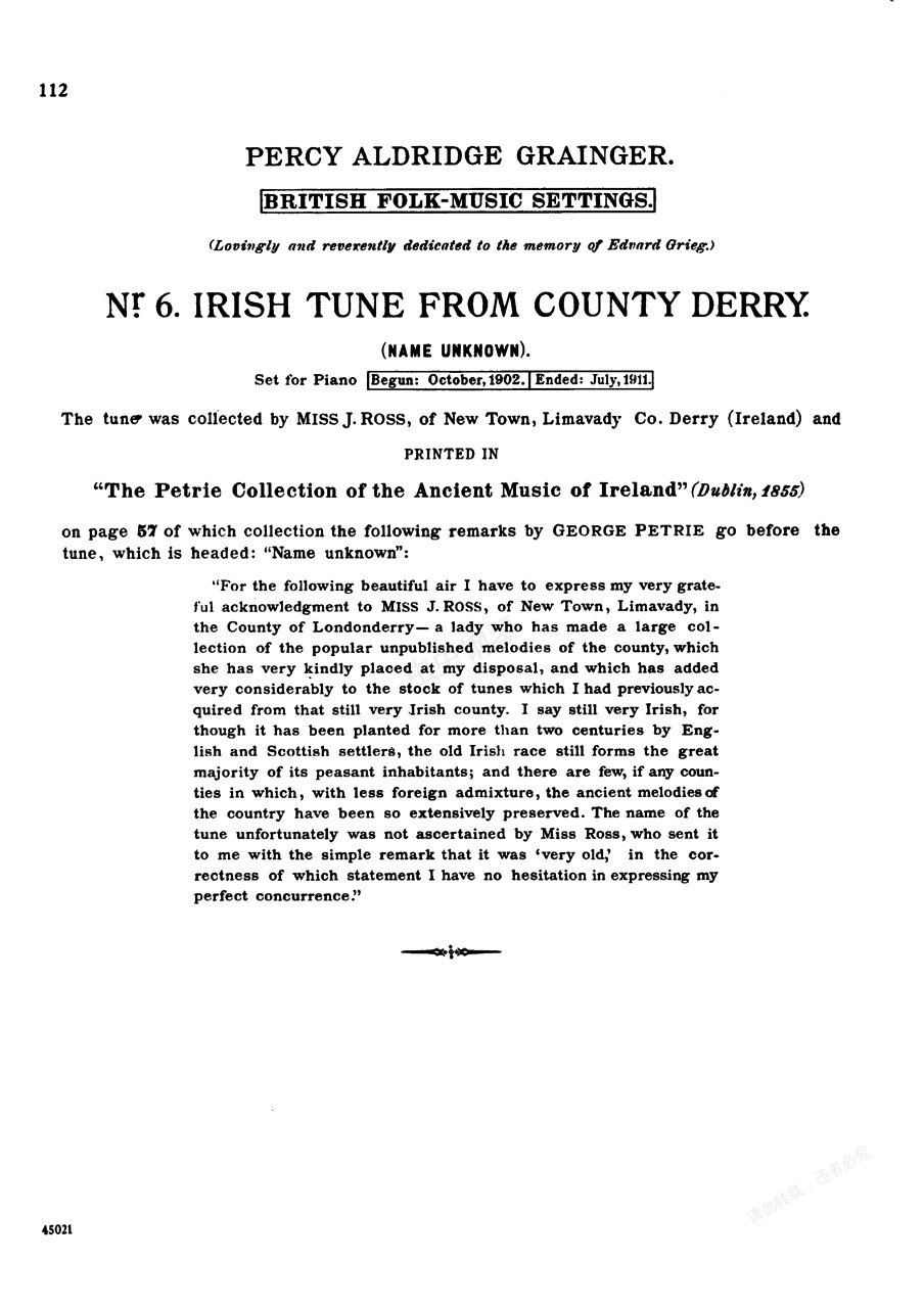 爱尔兰德里小调 Irish Tune From Derry《爱尔兰德里小调》Irish Tune From Derry ,为《英国民间曲调集》 中的第六首,主题由简·萝丝(Jane Ross)小姐收集,曲名不详。葛仁杰最先是于1902年将它改编成无伴奏混声合唱曲,直到1911年方改编成钢琴独奏曲。采用降E大调,4/4拍,自由但不过分的慢板。旋律委婉,令人感到辛酸。葛仁杰随后还将其改编成弦乐版,使其更广为流传。
